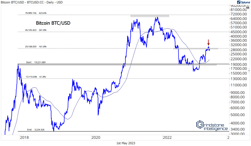 Bitcoin has been one of the best places to invest in 2023, with a year-to-date gain of more than 70%. It’s still stuck below last summer’s key breakdown level, though, after briefly surpassing it in April. A sustained move above 30,000 would go a long way toward convincing us that the intermediate-term trend has changed.