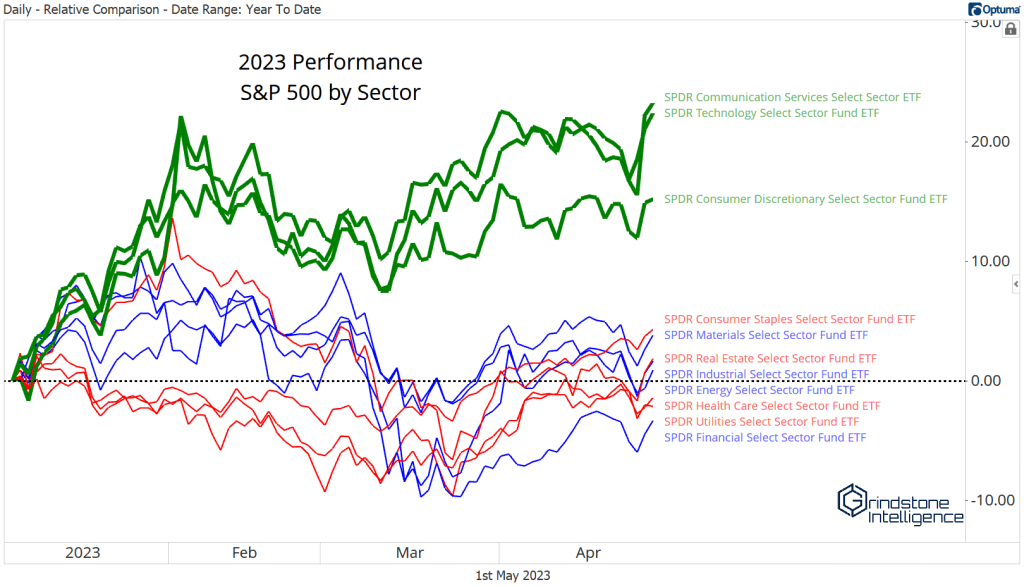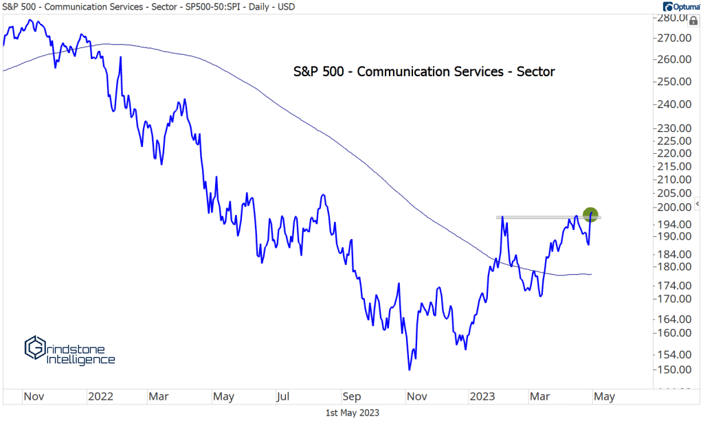The Communication Services sector has rallied 23% through the first four months of 2023, thanks in large part to a 92% year-to-date gain for Meta Platforms. Communications ended last week at its highest level since last August.