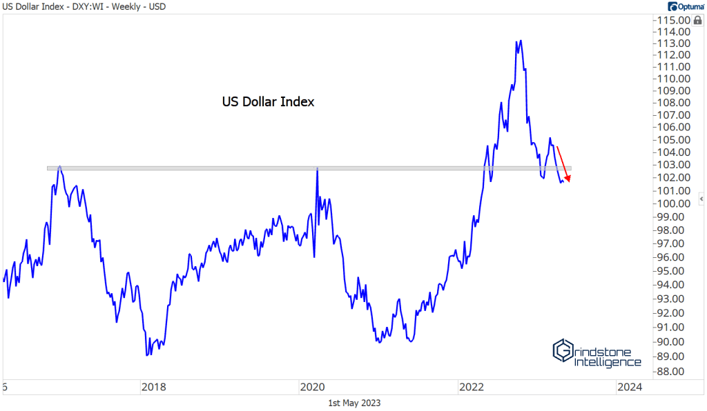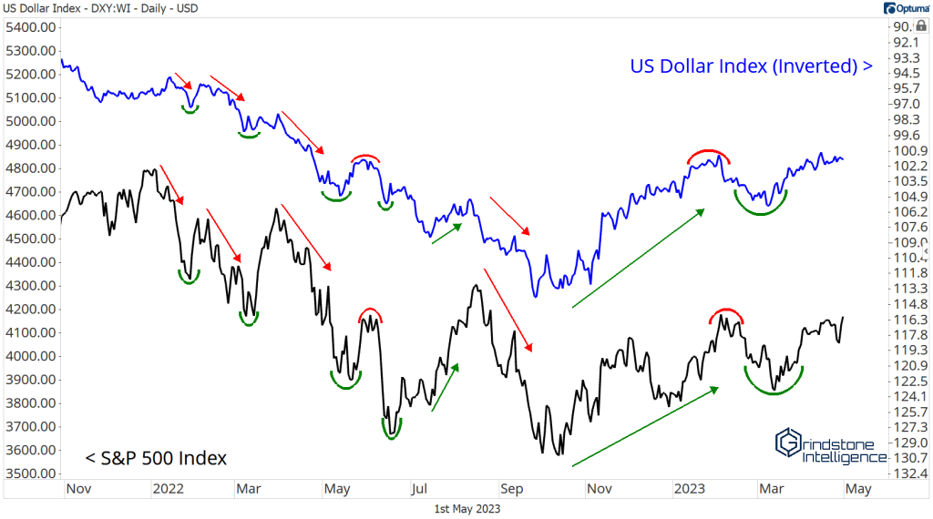 All throughout 2022, the US Dollar was in the driver’s seat. Each time the Dollar Index touched a new high, stock prices fell to new lows. That negative correlation is still very much alive – except those Dollar headwinds have turned into tailwinds. The DXY is at its lowest level since last April.