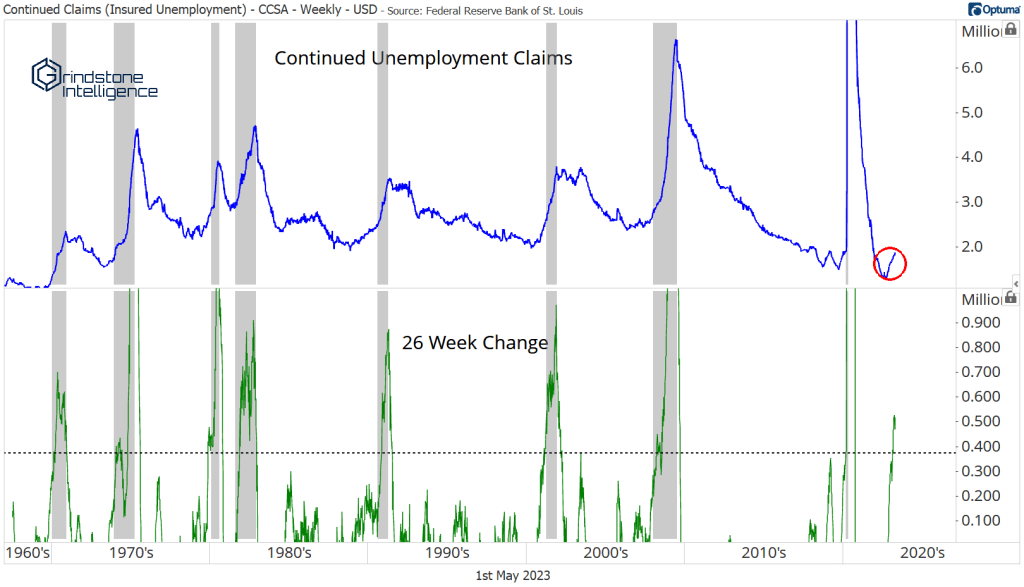 Inflation is still too high. Year-over-year growth in CPI has declined for 9 consecutive months, but that decline is largely attributable to normalization of goods prices. Core services prices are still near 40-year highs. Meanwhile, the labor market is starting to show signs of weakness. The number of continuing jobless claims remains quite low, but the 6-month change is cause for concern. We’ve never seen claims increase at this pace outside of a recession. The Fed has to weigh the risk of pushing the economy into a downturn against the risk of letting inflation remain higher for longer.
