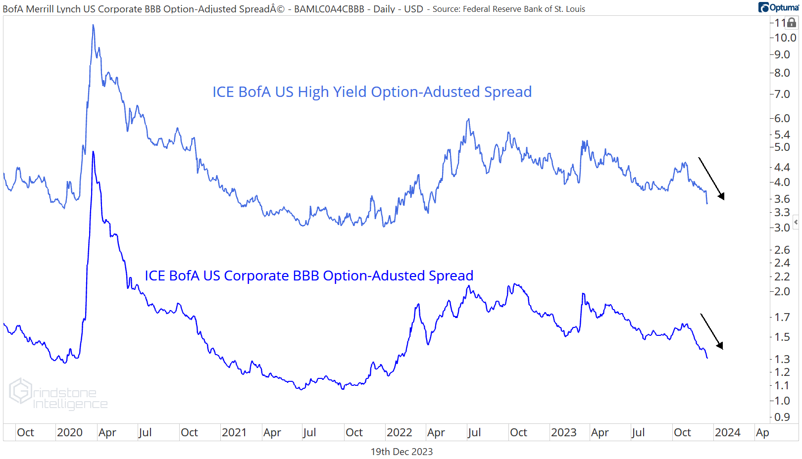 If investors feared the US was on the verge of recession, we’d expect to see the riskiest borrowers paying higher and higher rates. We’re seeing the opposite. Credit spreads are dropping.