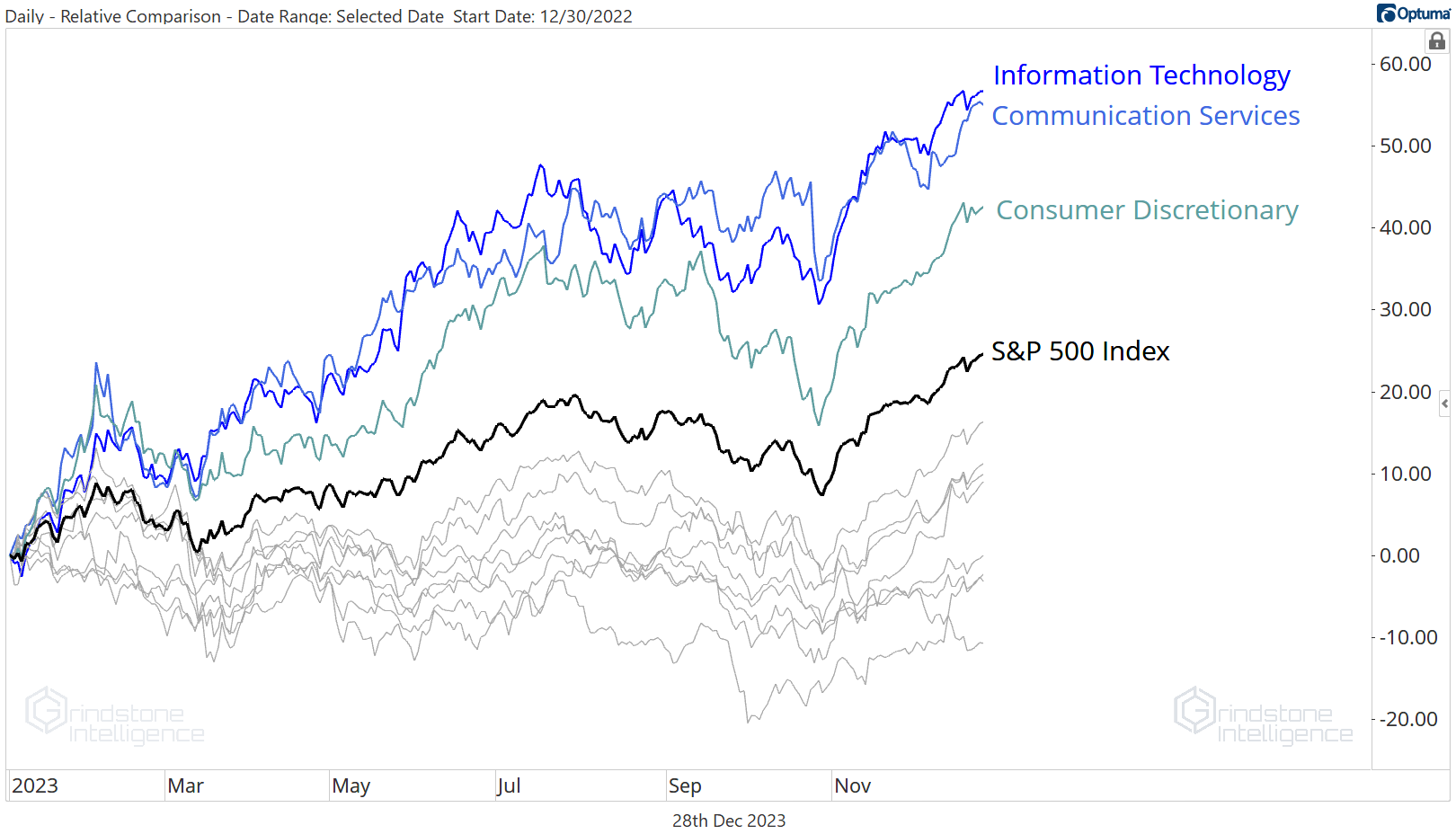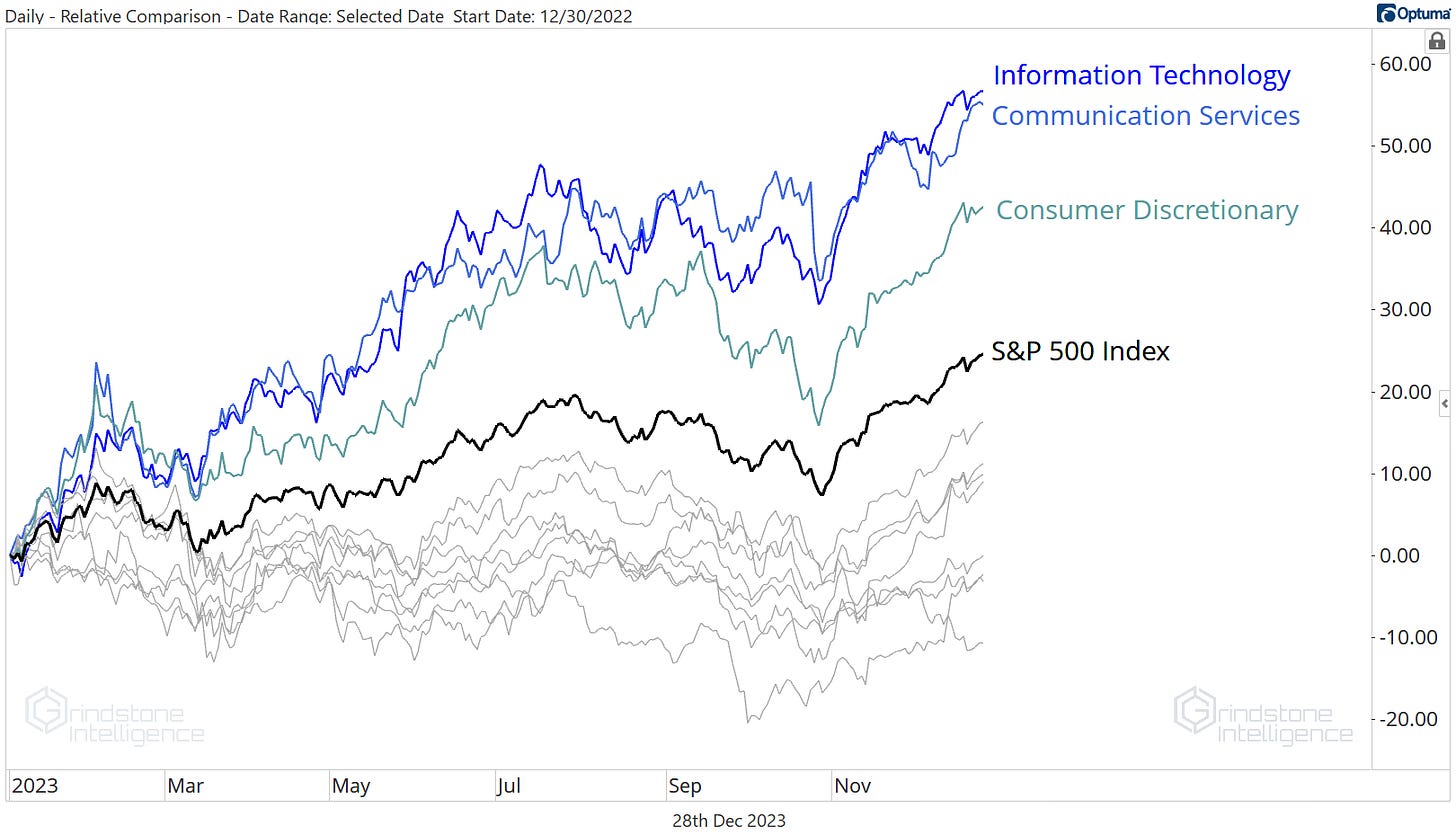 Growth-oriented sectors were all the rage in 2023. Information Technology, Communication Services, and Consumer Discretionary all rose more than 40%. None of the other 8 sectors were able to even keep pace with the benchmark S&P 500 index.