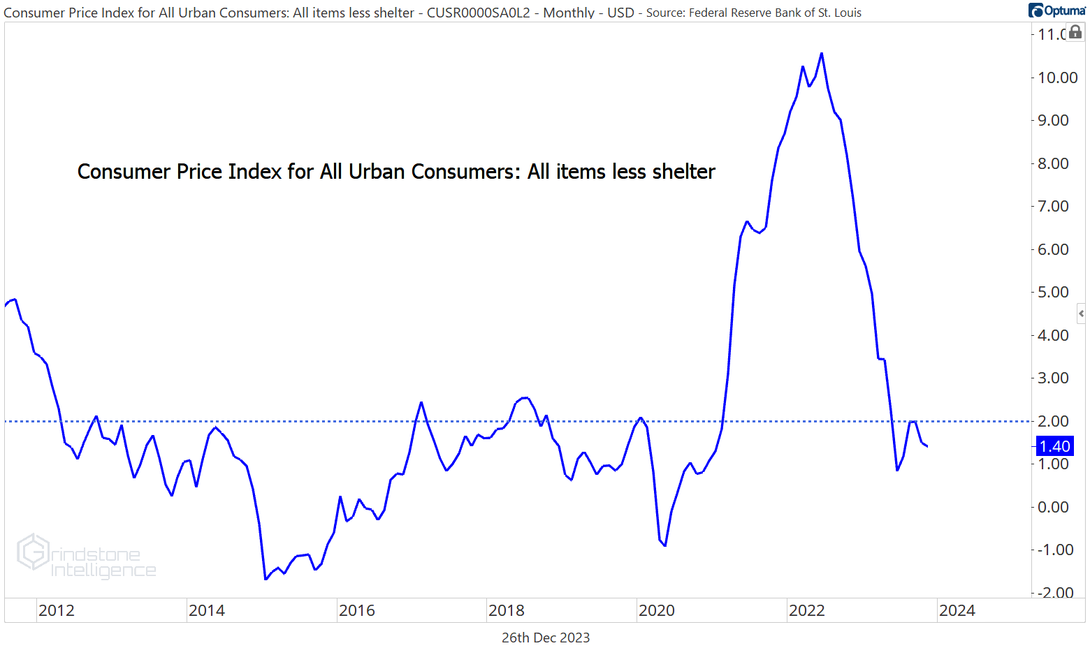 How can the Federal Reserve be thinking about cutting rates next year when headline inflation is still well above their 2% annual target? Probably because underlying inflation has been under control for awhile now. The year-over-year change in CPI ex-shelter dropped below 2% over the summer. On a 3-month annualized basis, this measure has been near 2% since last October.