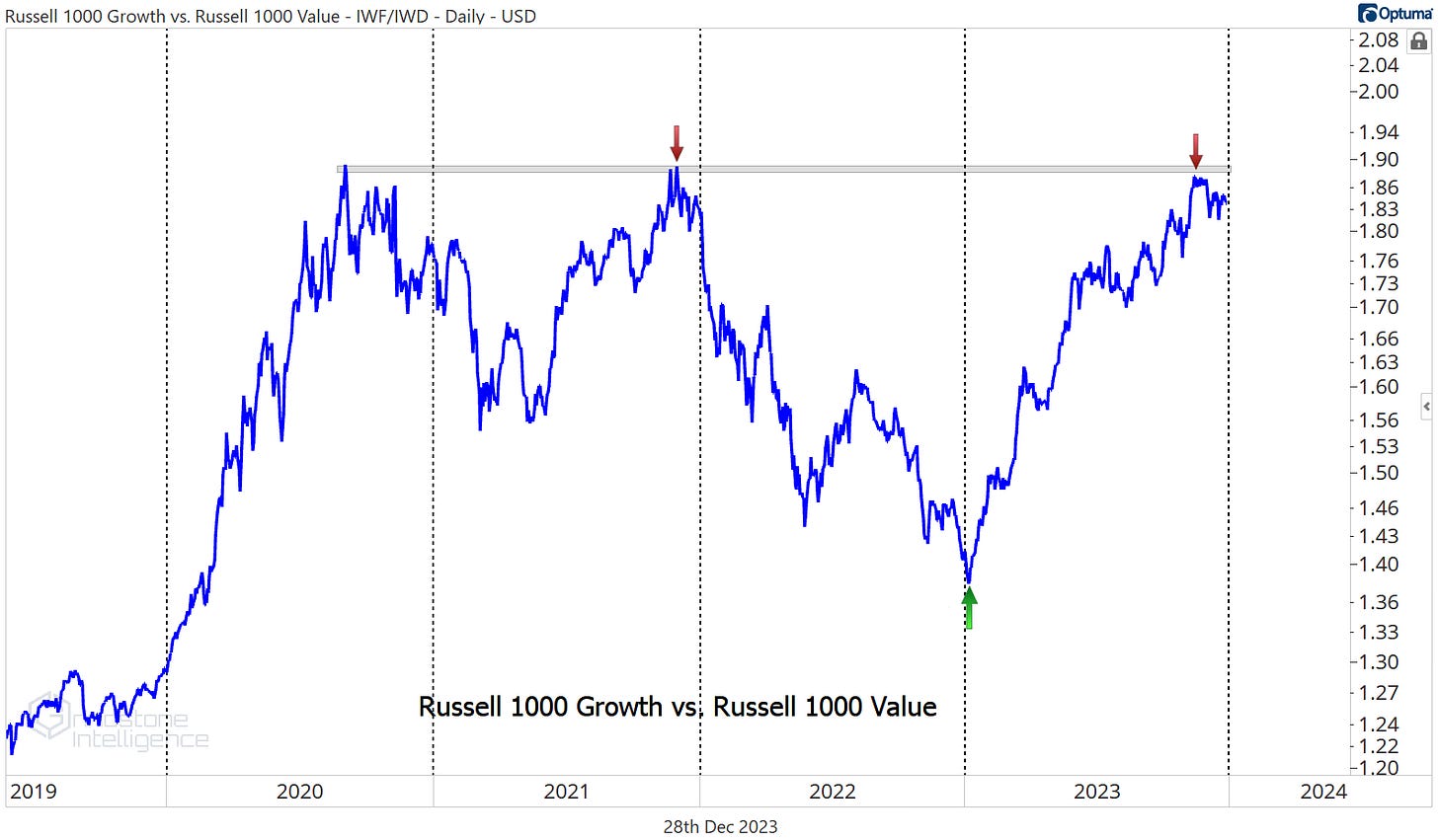 It’s remarkable how market leadership has reversed course with the turning of the calendar over the past few years. Value took charge at the end of 2021, then handed the reins back to growth at the end of 2022. Now, the Growth/Value ratio is right back where it was 2 years ago. Will value fall back in favor in 2024?