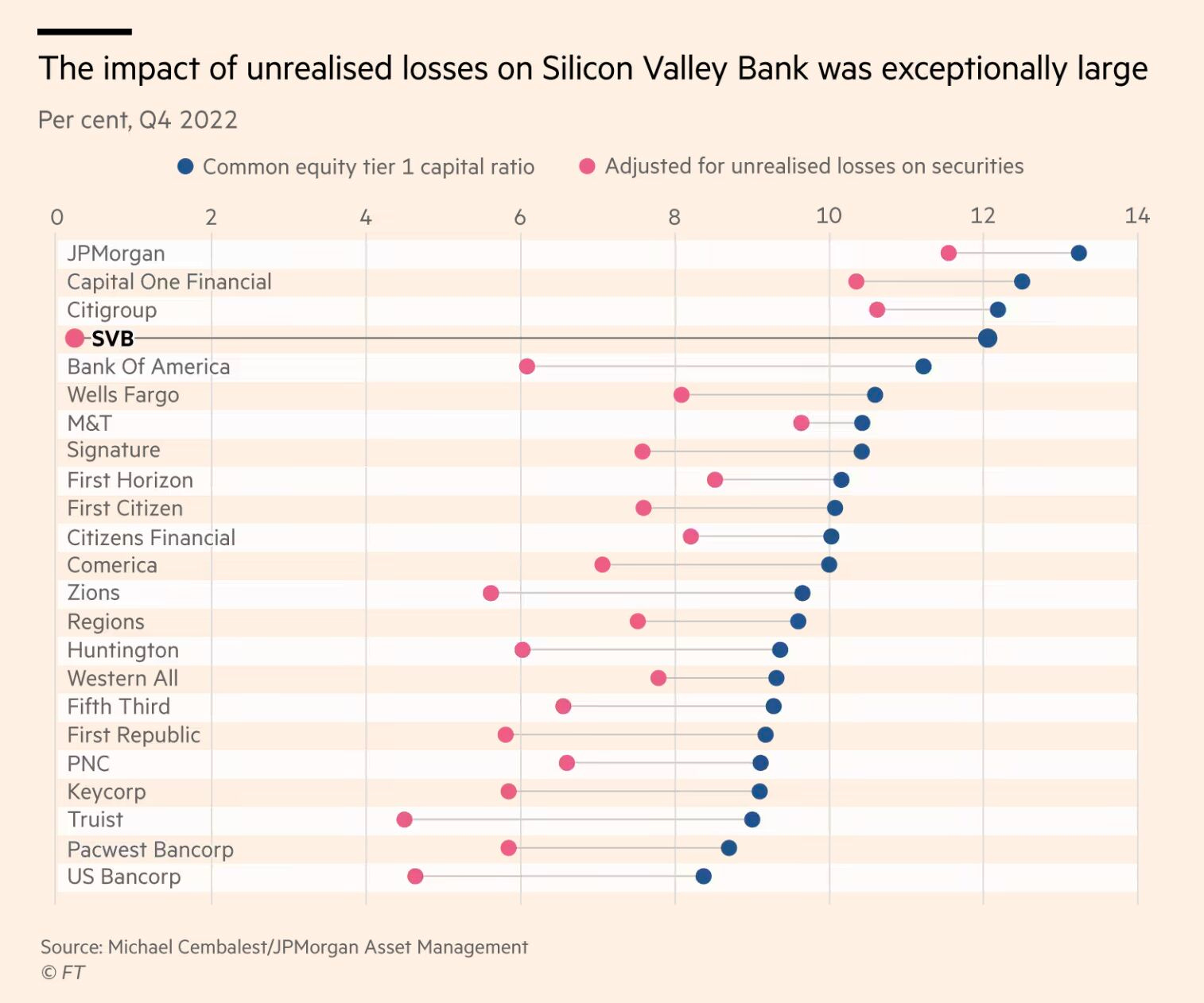 Though unrealized losses were (and perhaps still are) a systemic issue, no bank was more poorly positioned than Silicon Valley Bank. If SVB’s tier 1 capital ratio had been adjusted for unrealized losses on securities, their ratio would have been near zero.
