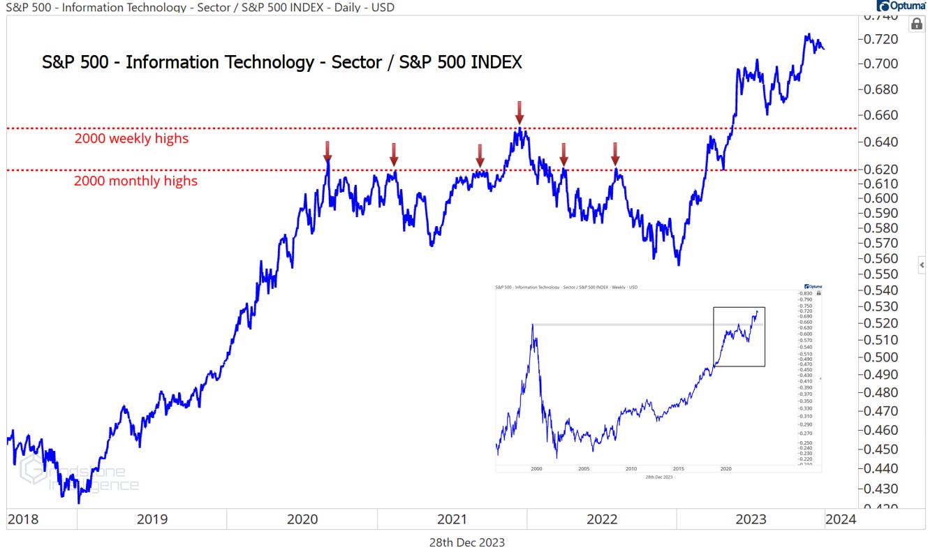 Tech’s outperformance finally pushed the sector past the dotcom bubble highs. It took 20 years for the Tech/SPX ratio to get back to the former peak, then it took another 3 years of digesting that peak before Tech found fresh air.