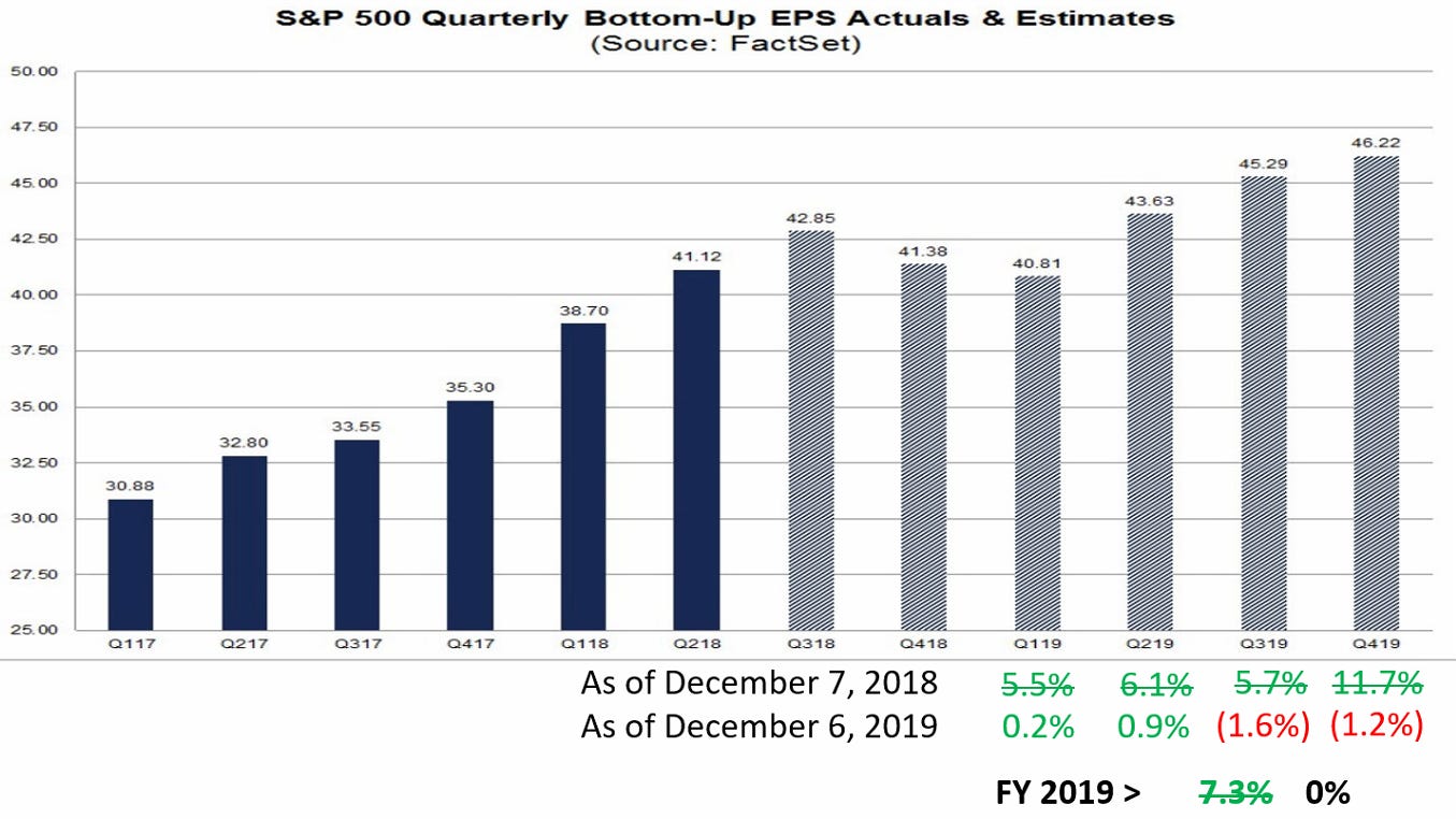 The remaining question is, how accurate will those consensus estimates turn out to be? Analysts tend to be overly optimistic. According to FactSet, estimates at the beginning of the year have been, on average, 6.9% too high over the last 20 years. Last year was no different. On December 7, 2018, the consensus estimate was for 7% earnings growth, much of it thanks to the 4th quarter’s anticipated boost of nearly 12%.