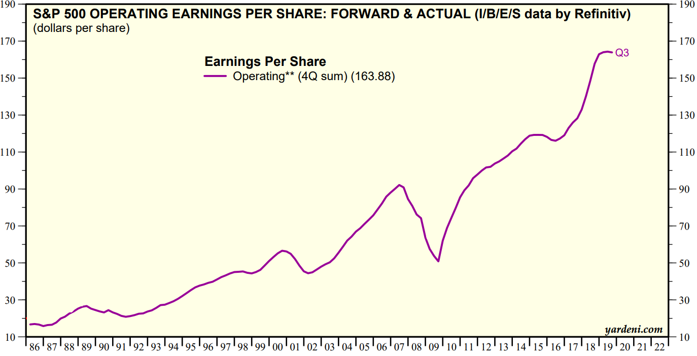 Following last year’s tax-cut-driven 20% increase in S&P 500 EPS, index earnings have spent most of 2019 going nowhere. The top line has been steady – revenues have grown in the mid-single digits. Profit margins, though, have been under pressure. Faced with increased costs from both labor and tariffs, margins have contracted from record levels in 2018. The result: trailing 12-month profits have spent the year stuck just below $170.
