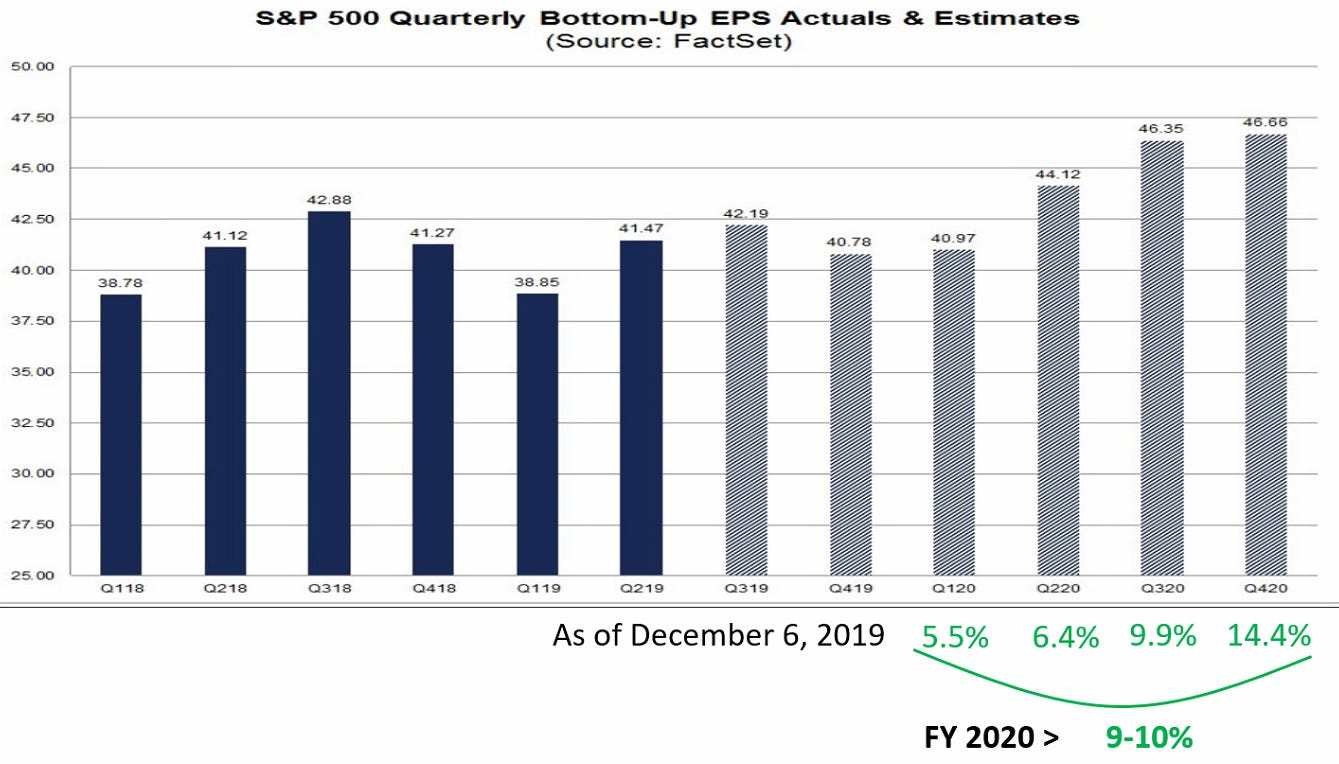 Of course, equities don’t really trade on what companies earned in the past – more important is what they’ll earn in the future. Earnings are expected to grow 9.7% in 2020, aided by another mid-single digit year from revenues and a stabilization in margins. Here’s the quarterly consensus EPS breakdown from FactSet, with implied year-over-year growth rates.
