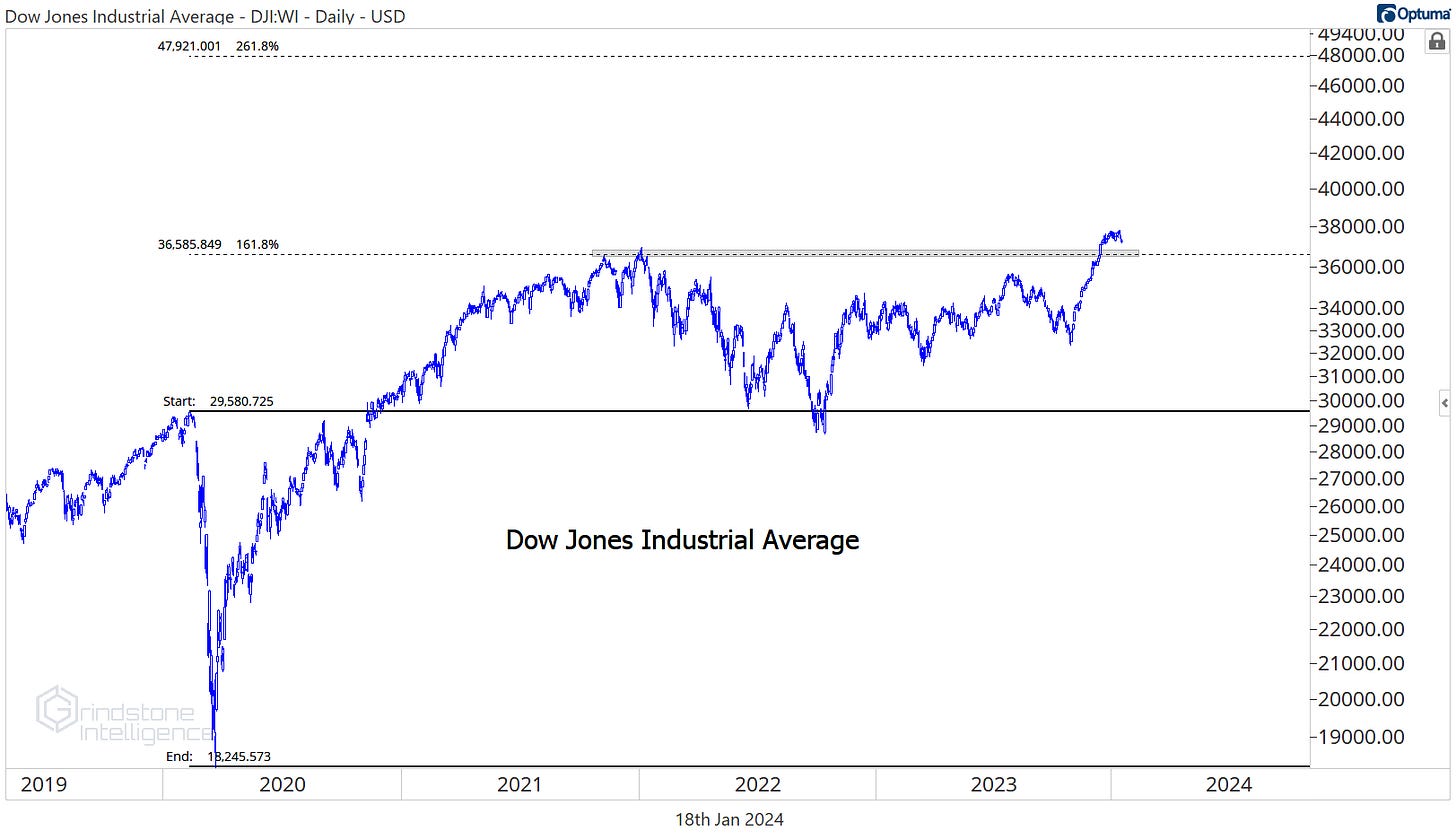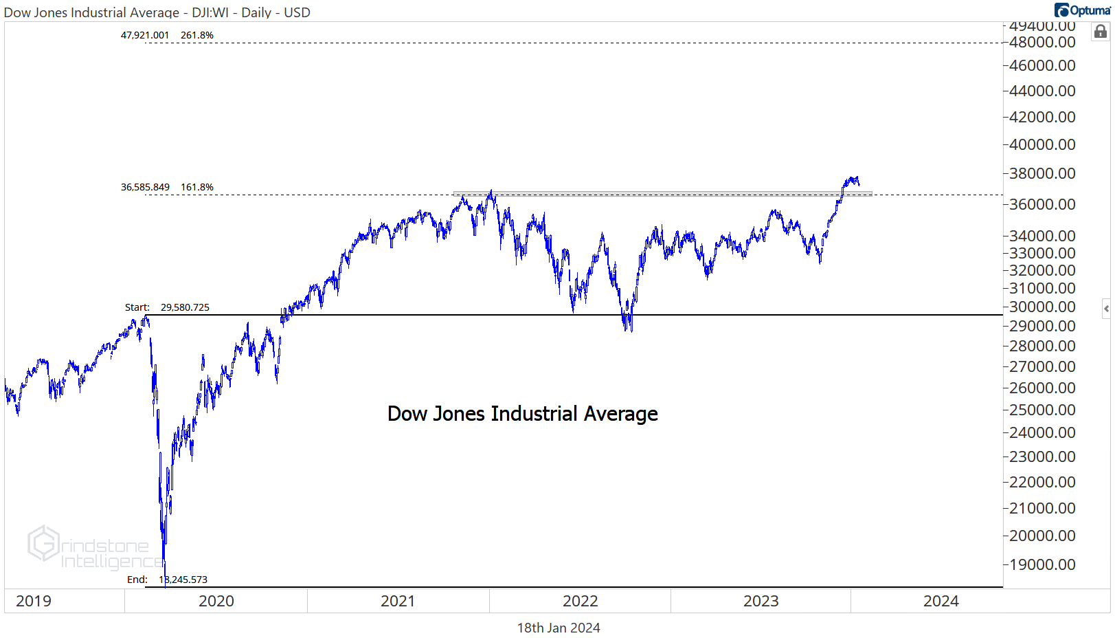 Back home, we’re watching the Dow Jones Industrial Average, which was the first of the major indexes to set new all-time highs. As long as the Dow is above 36500, the trend remains intact.