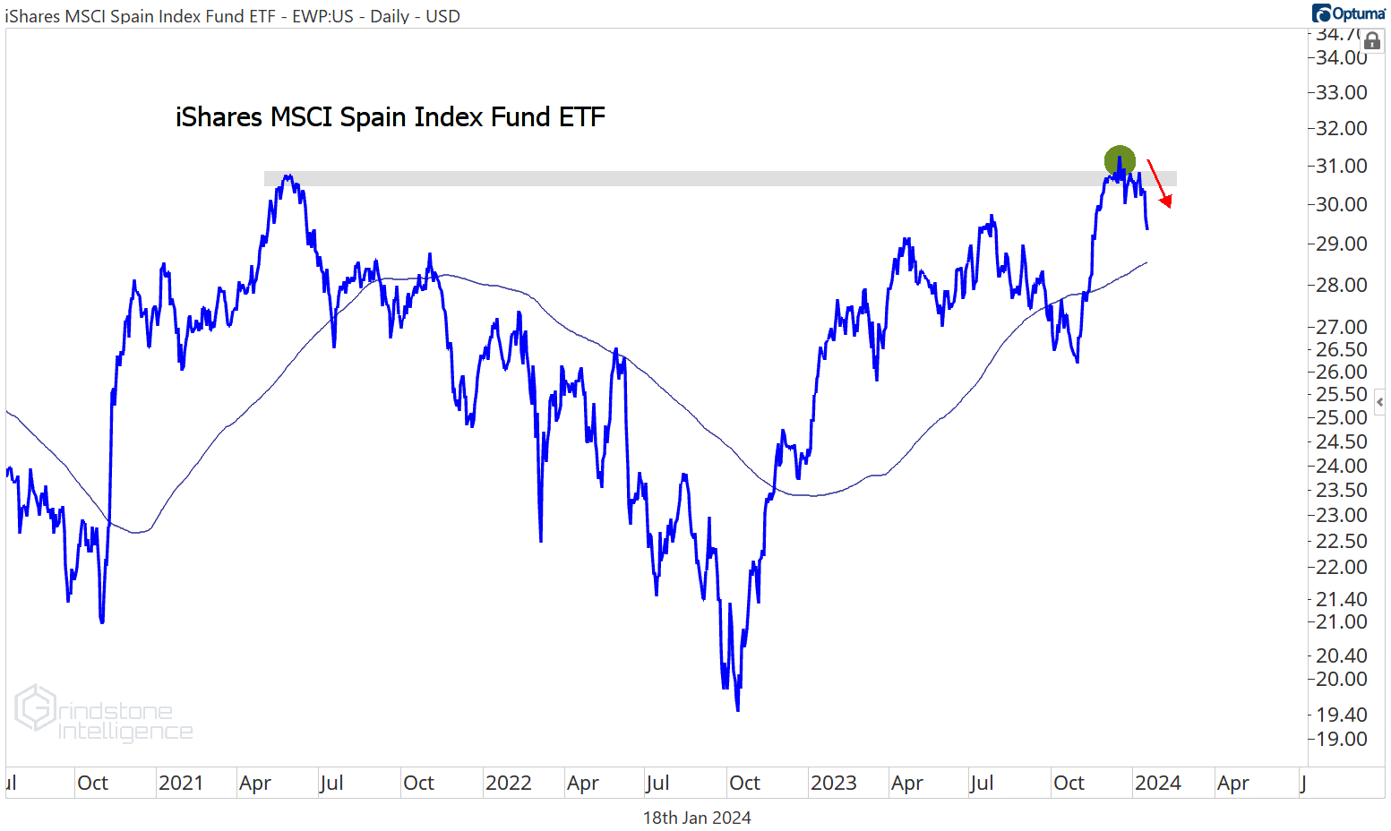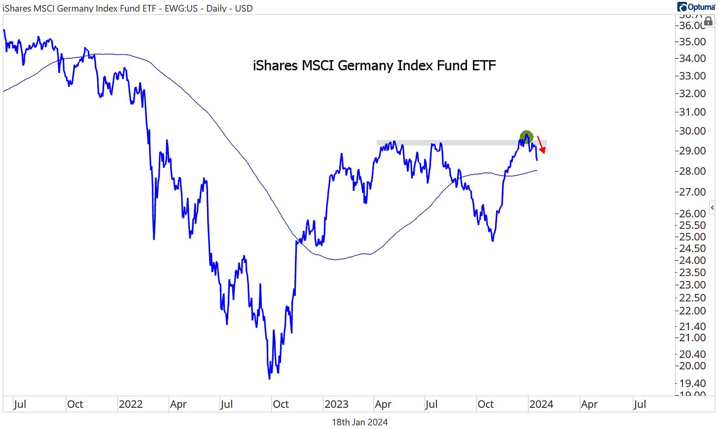 But bulls need to make sure they defend the breakout level on this backtest. Already, the iShares Germany ETF (EWG) is back below that former resistance level.