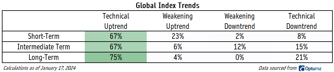 Even though markets have faced some headwinds to start 2024, pullbacks haven’t resulted in significant damage to underlying trends. Two-thirds of the global indexes that we track are above rising short and intermediate-term moving averages. Three-quarters of them are above a rising long-term moving average. That’s not the type of thing you see in bear markets.