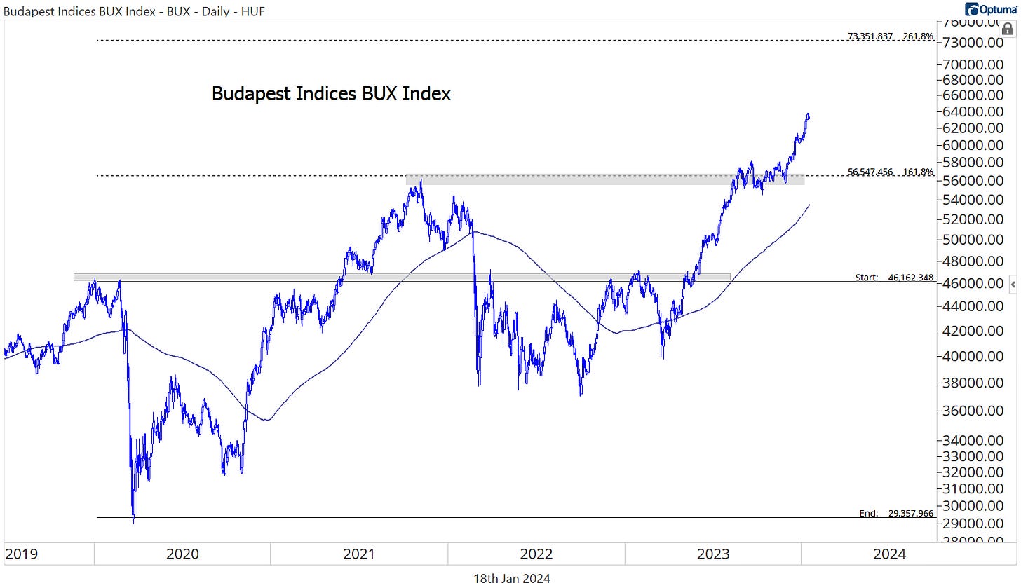 The BUX broke out to new highs in December, finally absorbing all the supply that came in near the 161.8% retracement from the 2020 decline. We’ve got our eye on the next key Fibonacci retracement level at 73000. That’s more than 15% higher from here.
