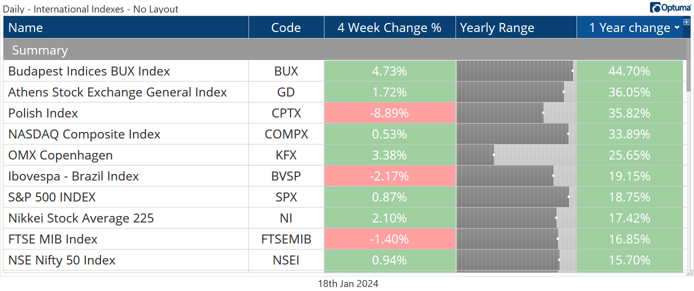For most of the last year we’ve seen the narrative that just a handful of mega cap growth stocks are rising. True, mega cap growth has been an important leader over the last 12 months. And true, some parts of the market (we’re looking at you, small-caps) have failed to participate very much at all. But this bull market was never about just a few stocks. If it were, US stocks would stand alone atop the global leaderboard. But it’s a 45% gain for the BUX Index in Budapest that holds the banner. Stocks in Greece and Poland are rocking, too - both have outpaced the NASDAQ in USD terms.