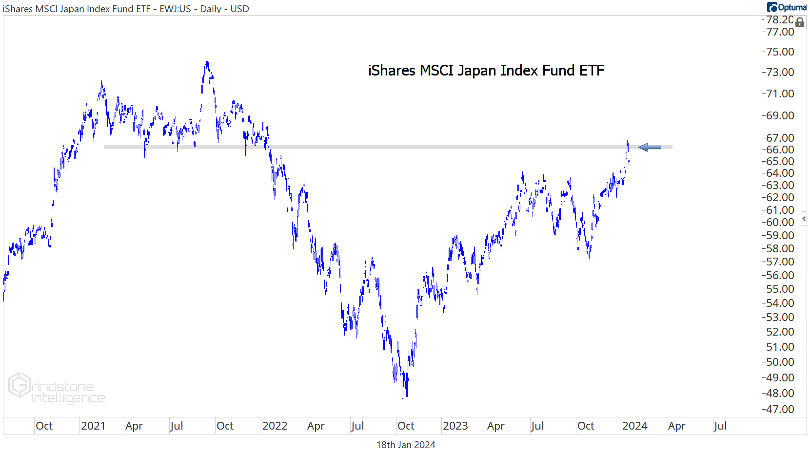 If you’re looking to get exposure to Japan, we only want to be long the EWJ if it’s above $66.50. That was the floor in 2021, and that former level of support is now acting as resistance.