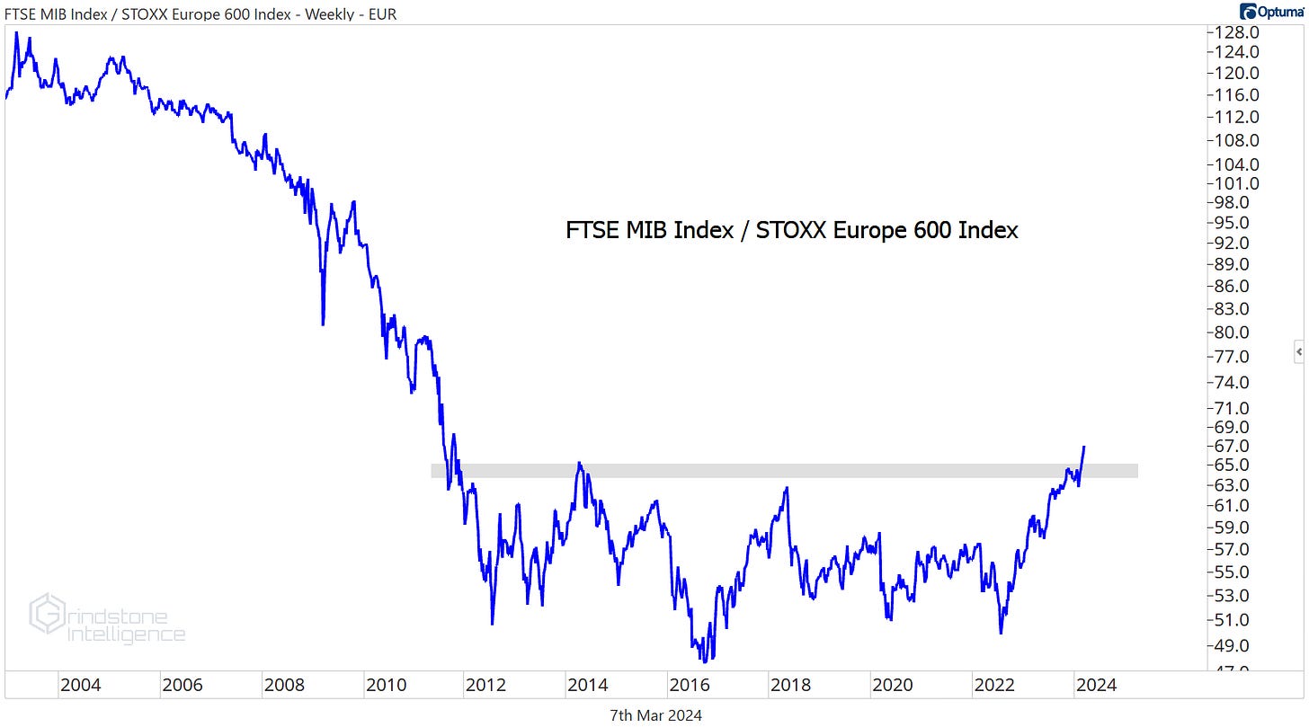 And it’s not exactly the stalwarts leading the way higher there, either. Just a few years ago it looked like Greece and Italy were going to be responsible for the death of the Euro. The Athens Stock Exchange Index is at 13-year highs. And Italy is breaking out of a 10-year base relative to the benchmark European index.