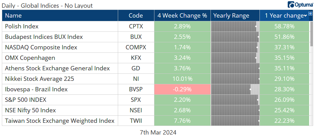 True, some parts of the market have failed to participate very much at all. But this bull market was never about just a few stocks. If it were, US growth stocks would stand alone atop the global leaderboard. Instead it’s a 58% gain for the CPTX Index in Poland that holds the banner. There’s no currency funny business driving that either. The returns below are all in USD terms.