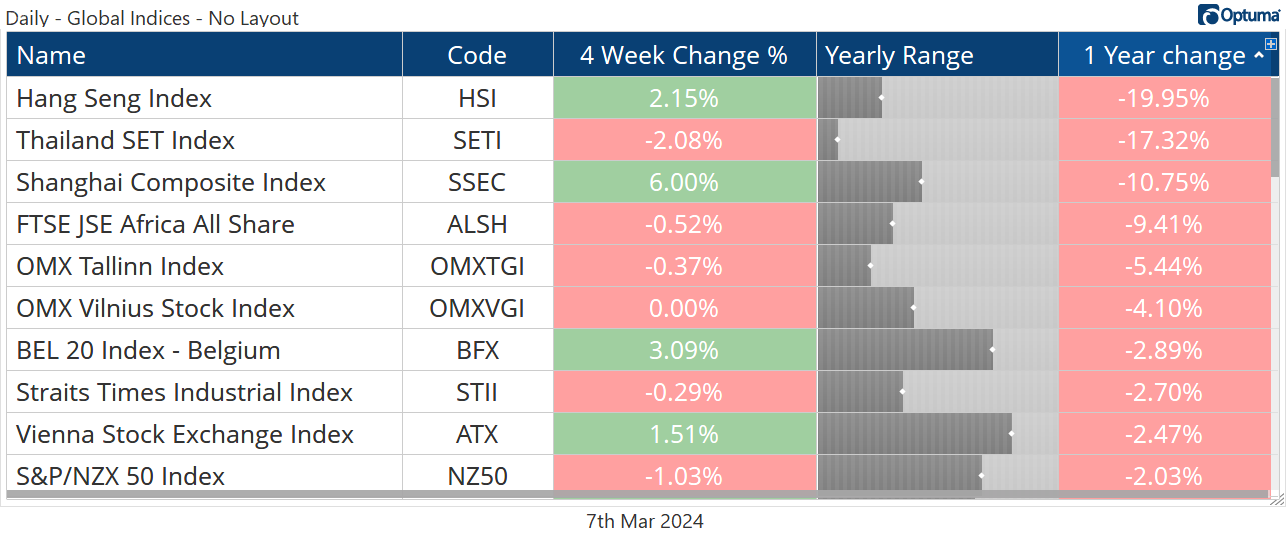 Now, just because there are broad pockets of stock market strength doesn’t mean every market has been off to the races. China has struggled to get anything going. The Hang Seng has dropped 20% over the last year, and the Shanghai Composite is down 10%.