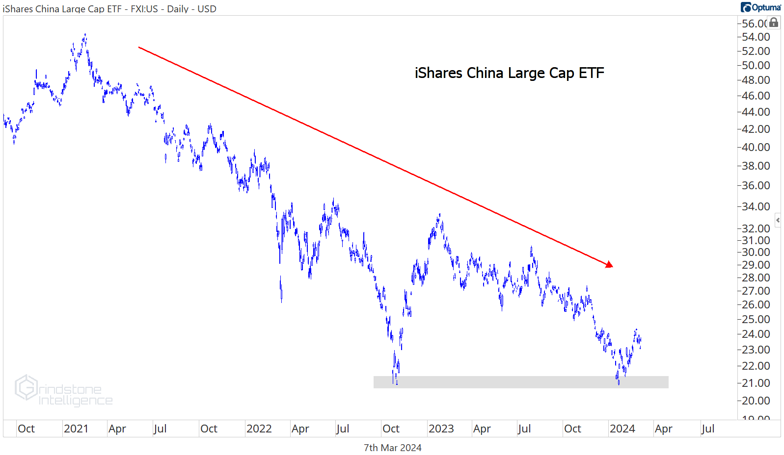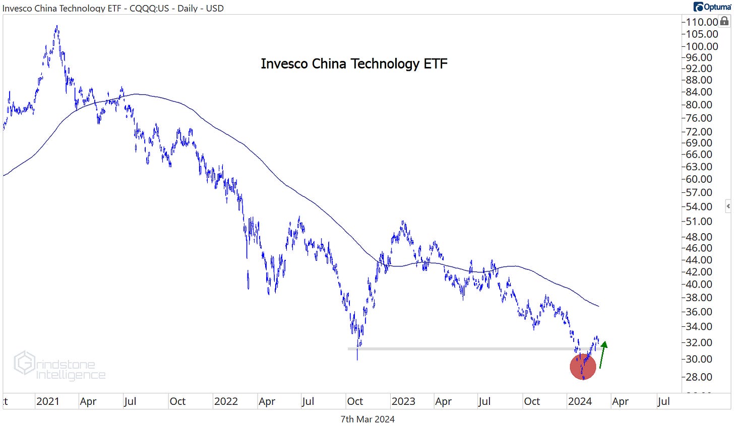We’ve got a similar failed breakdown shaping up in CQQQ, the China Technology ETF. There’s plenty of work to do before saying a trend reversal is in place, like getting back above the 200-day, but things at least things aren’t getting worse.