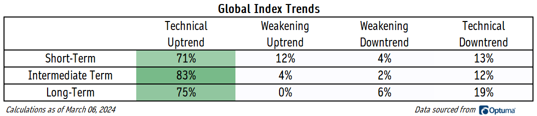 At least 70% of the global indexes that we track are above rising short, intermediate-term, and long-term moving averages. Less than 20% are below a falling moving average.