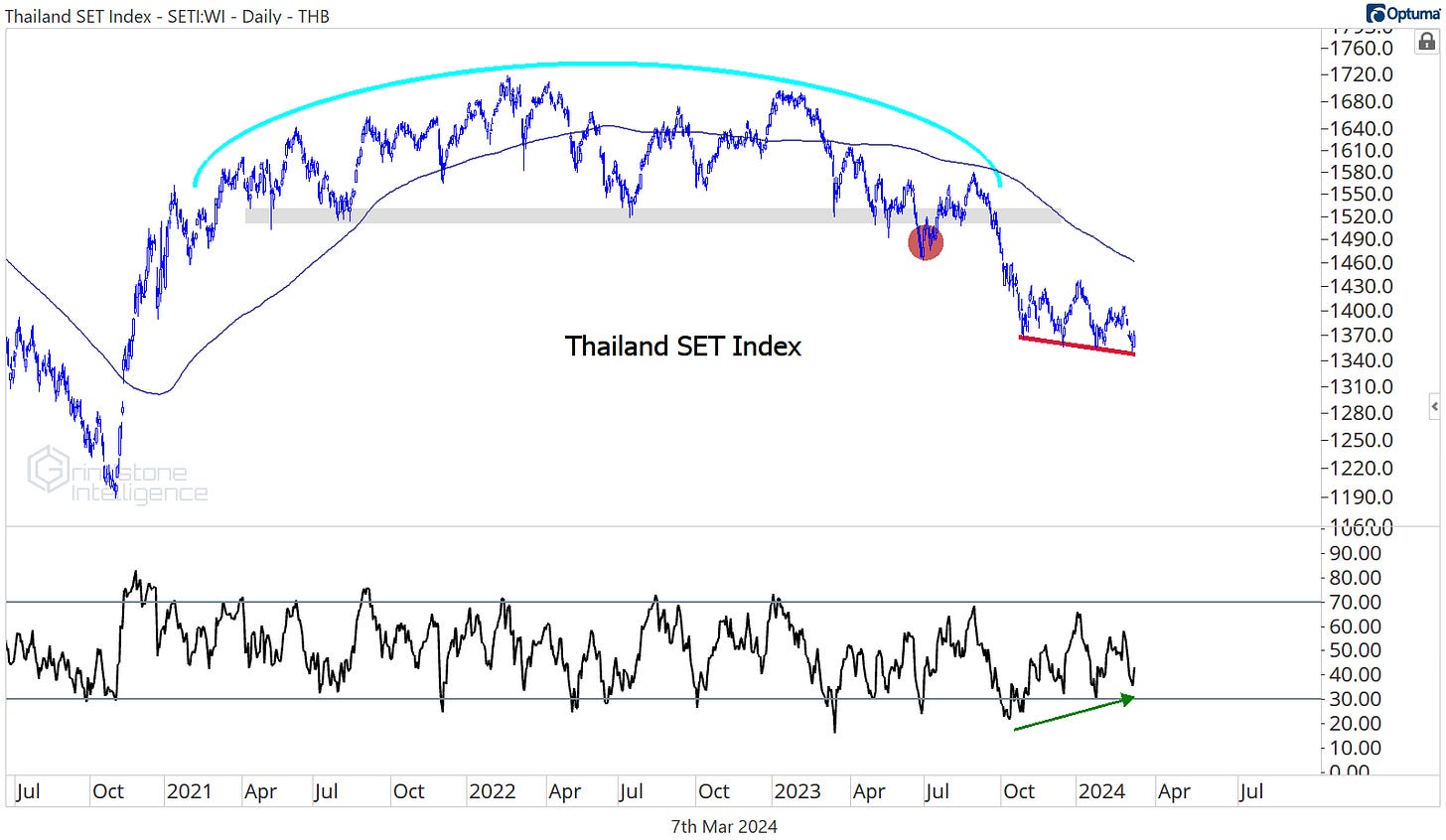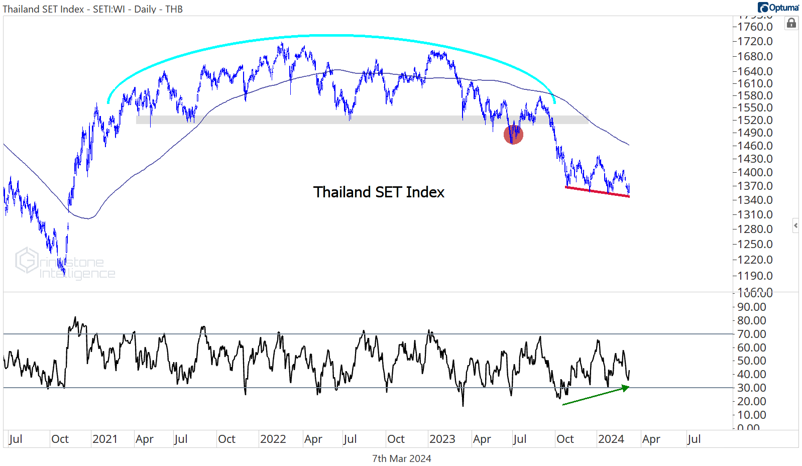Thailand has been another stinker. After a multi-year topping pattern, it broke a major support level and has kept falling ever since. Since October, though, RSI momentum has been steadily improving.