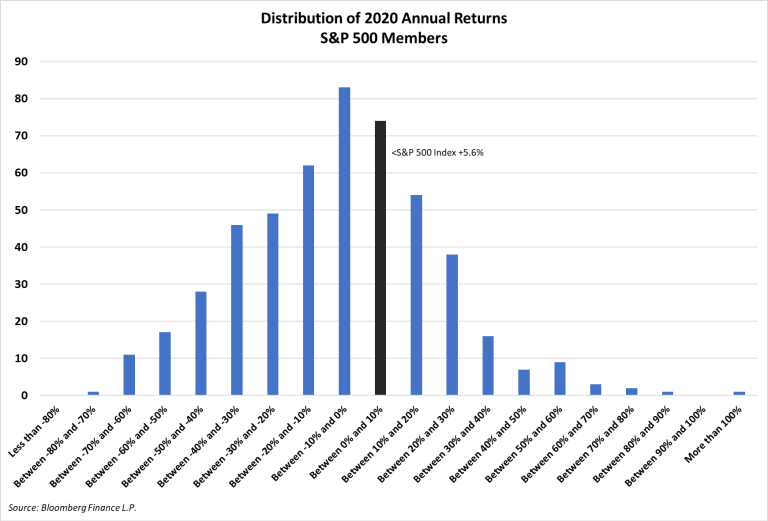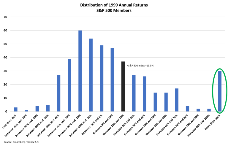 There is one sharp distinction between the internet bubble and the buy-the-dip boom of the late 2010s that can’t be seen in the chart above, though. Consider the distribution of returns for two of the most comparable years: 1999 and 2020. Two-thirds of stocks lagged in each of those years, and the leadership of tech stocks was to blame. But in 2020, excess return was generated by huge stocks that put in above average performance. The distribution of returns is almost normal. In 1999, though, excess return was generated by above average stocks that put in huge performances. Check out the fat tail in 1999!