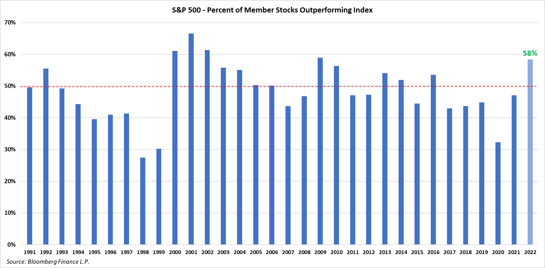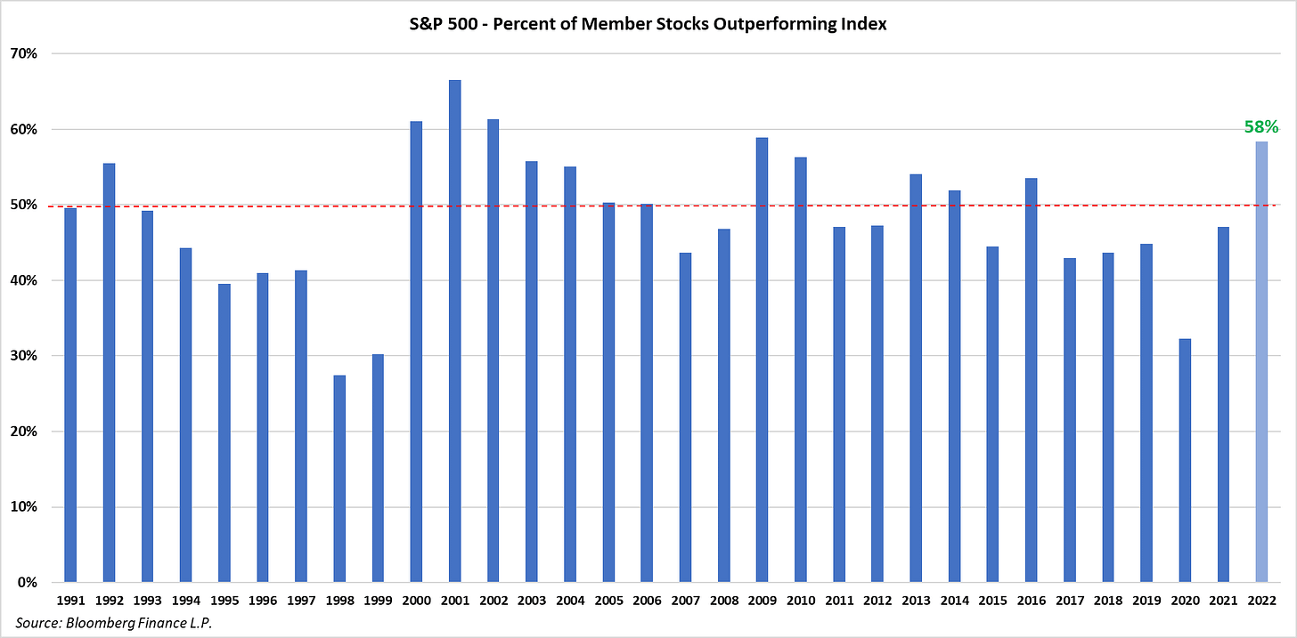 2022 has been an exception to the rule. More individual stocks are outperforming the index than in any year since 2009.