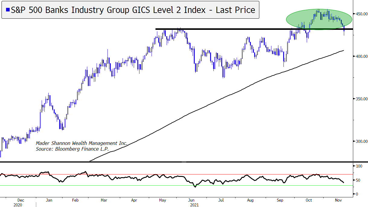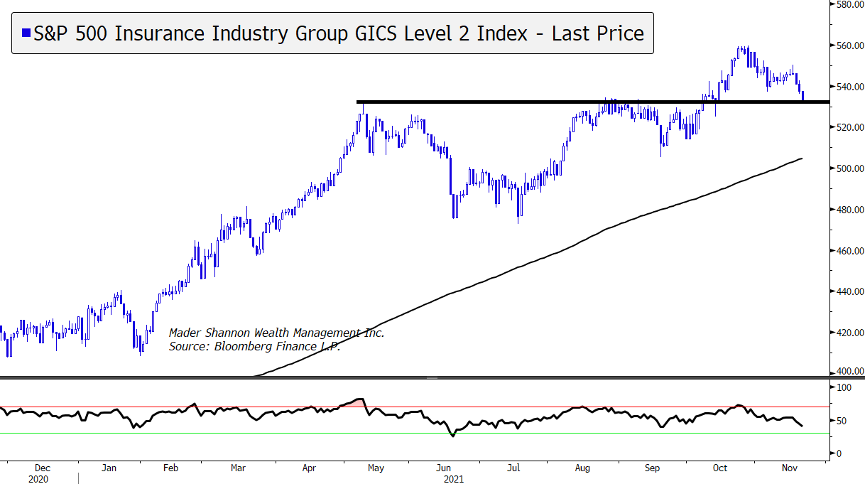 Financials got whacked on Friday, as well, but the key support level for them isn’t as obvious. The setups for two key industries – Banks and Insurance – are much cleaner, though. The damage? One failed breakout and one group hanging on by a thread.