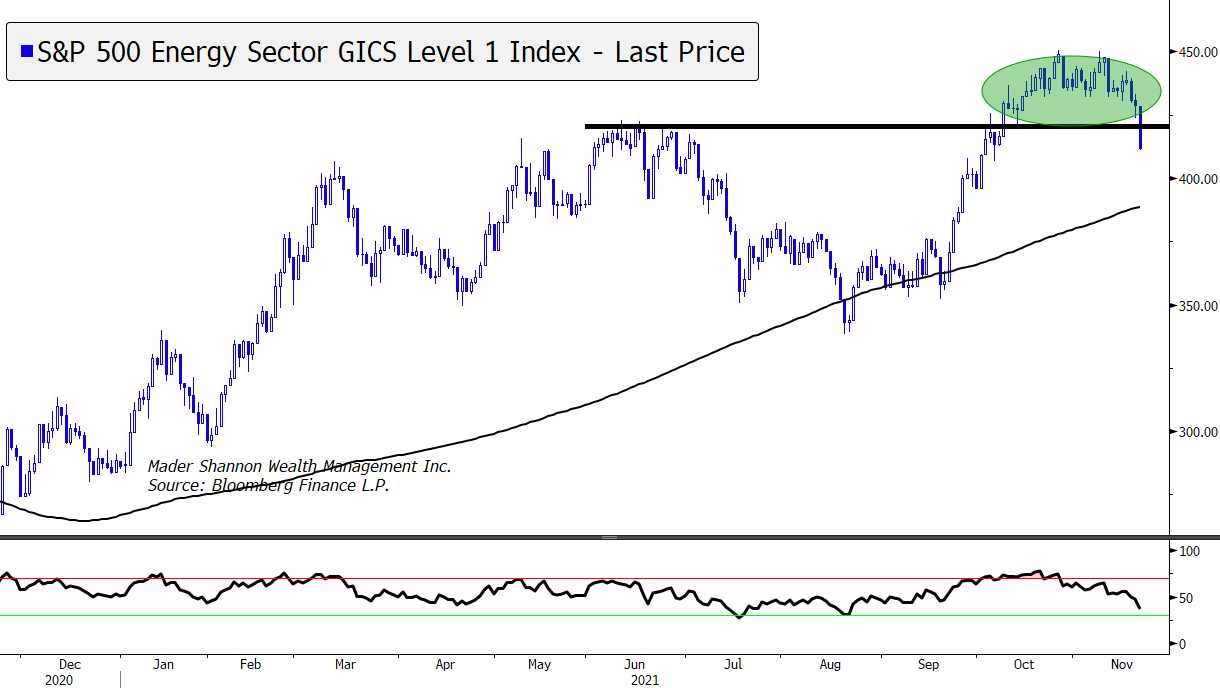 Look, Consumes Staples aren’t that important either. They’re only 5% of the index and not exactly the place you look for leadership during a bull market. I get it. But it’s not just Staples. After Friday’s ugly performance, you can add Energy stocks to the list of disappointing price action.
