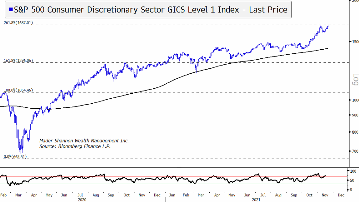 Consumer Discretionary kissed its 261.8% extension, backpedaled, and is testing resistance again. There’s no reason it can’t keep going higher, but this would be a logical place for an extended pause – or a reversal.