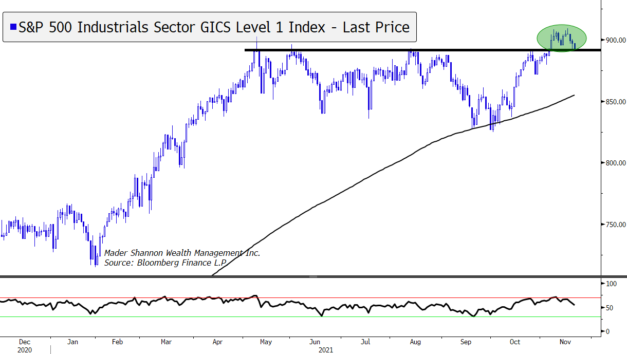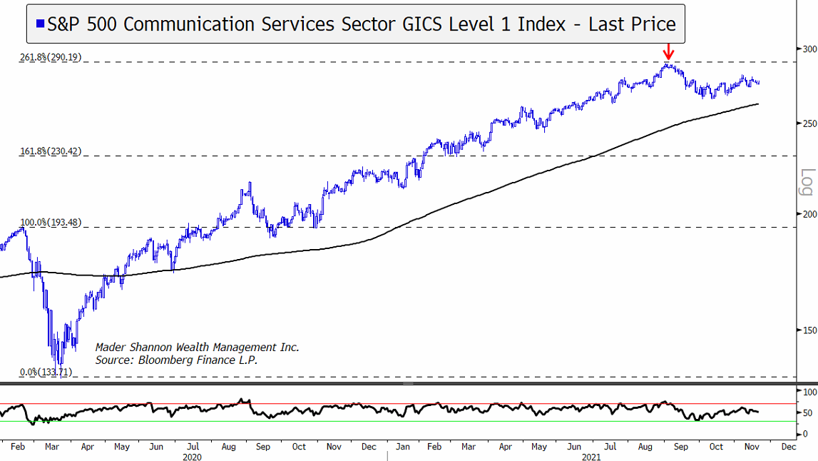 Meanwhile, former leadership groups have hit key extension levels from the COVID collapse. Communication Services peaked in August: