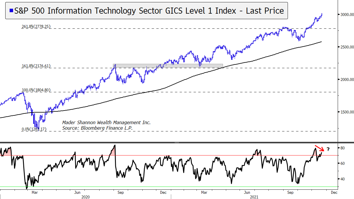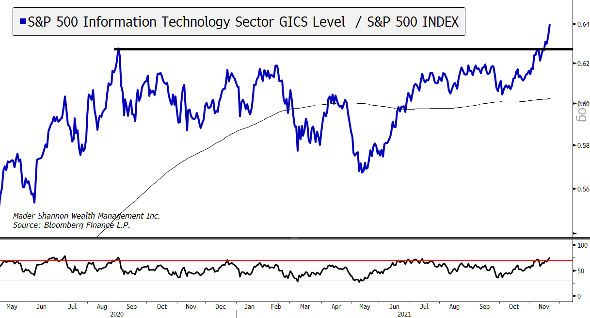 So who else could lead stock indexes higher? Health Care and Real Estate both peaked in the summer. The Utilities haven’t even challenged their pre-COVID highs. The answer, of course, is Tech. Information Technology makes up more than a quarter of the S&P 500, and not only has it trended higher with the market, it’s been showing relative strength.