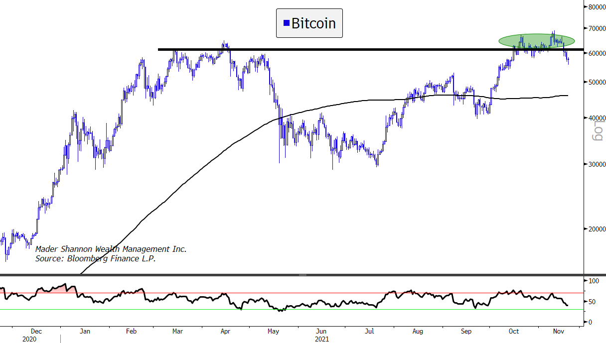 I’ve never talked about crypto on this blog, mainly because there are so many other people talking about it that not much more needs to be said. But Bitcoin can be a good indicator of risk appetite, and we can add it to the list of assets failing to stay above previous highs.