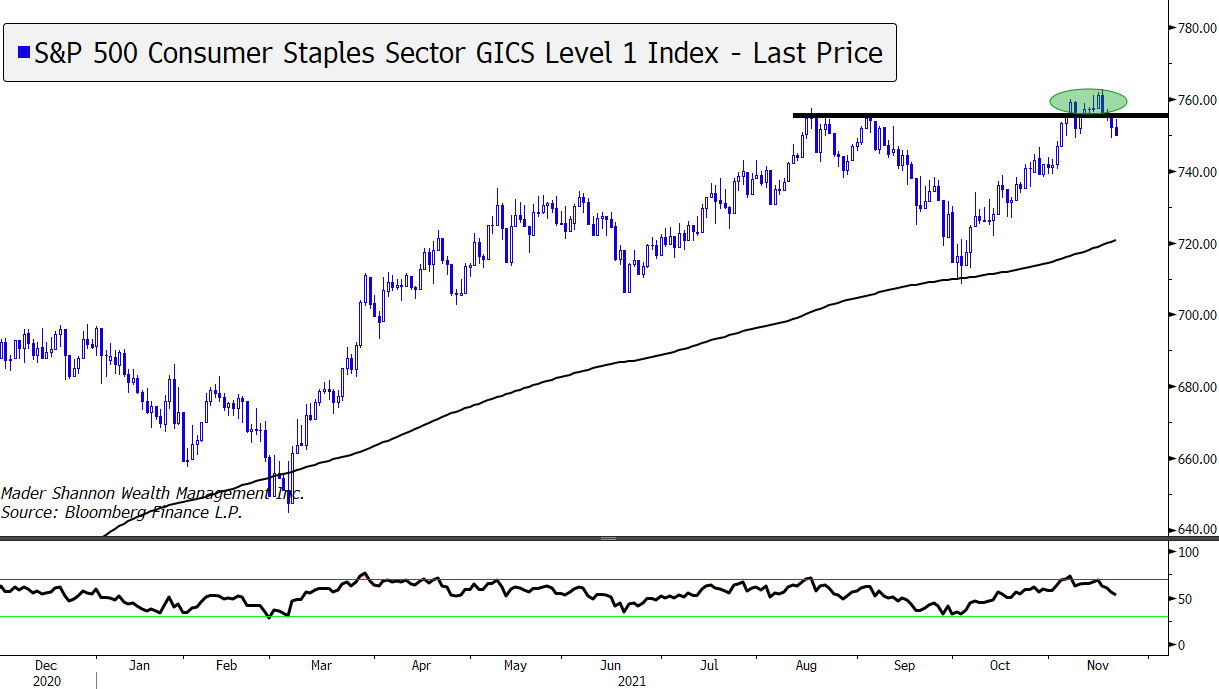 In the grand scheme of things, though, the Materials sector isn’t that important. Its total market cap comprises less than 3% of the S&P 500 Index, making it among the smallest sectors. The problem is, it’s not just Materials. There’s also a failed breakout in Consumer Staples.