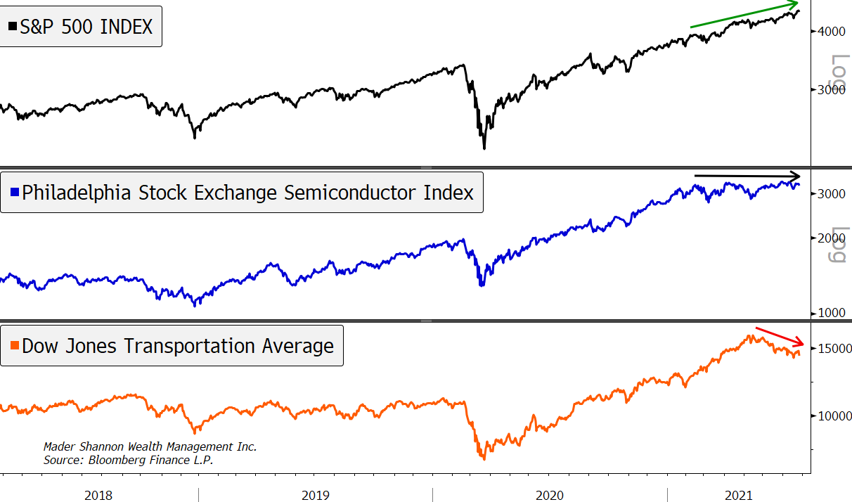 One of Dow Theory’s most popular tenants is that Transports should confirm higher prices in stocks, but they haven’t. They’ve been falling for a few months. Some argue that the world has changed – Railroad and Trucking companies don’t have the same importance in a digital world. Perhaps they’re right. But Semiconductors, the industry most commonly substituted for Transports in a so-called “New Dow Theory”, have been flat since February. In either case, new highs for the headline indices are still waiting for a thumbs-up from Mr. Dow.