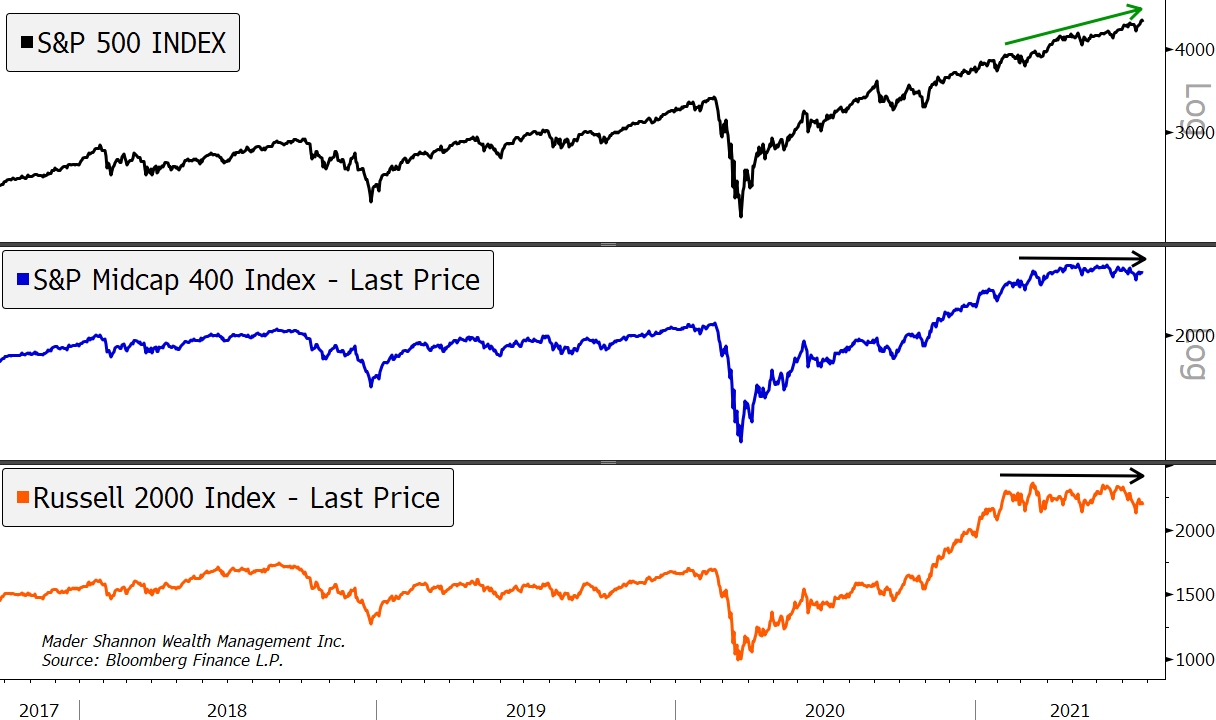 Small and Mid-cap stocks aren’t playing along either. The Russell 2000 peaked in March. Mid caps did so in April.
