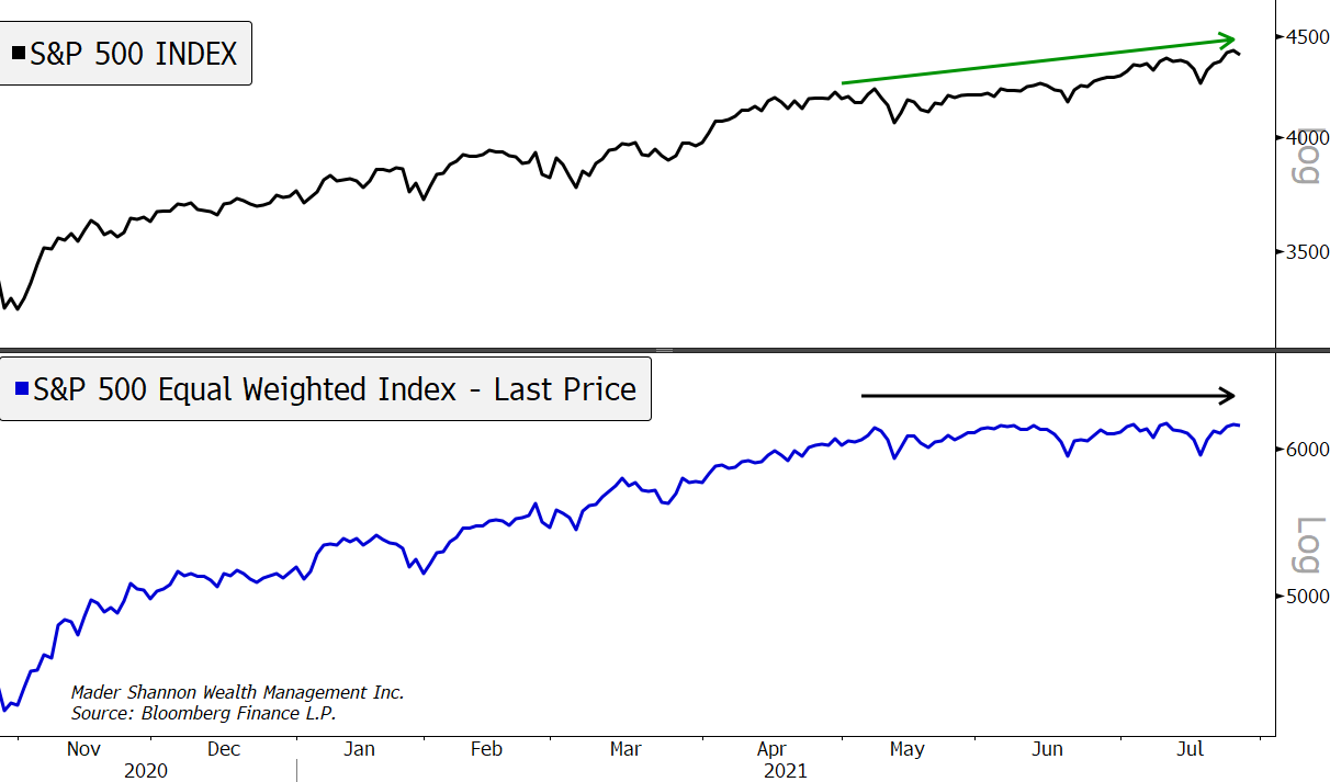 Equal-weight stock indexes confirm a lack of participation. The S&P 500 is a market capitalization-weighted indexes – the largest companies have the largest weight. Giving each stock the same level of importance, regardless of size, results in an index that’s been flat since May.