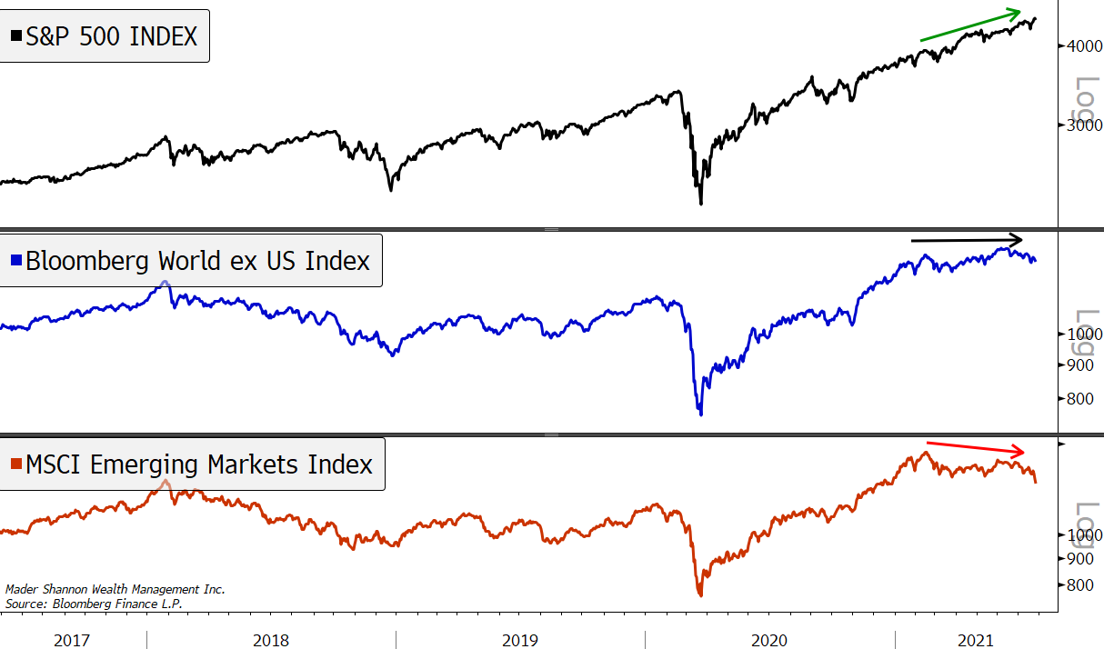 It may look like I’m just pasting the same chart over and over again, but I’m not. International stocks are struggling to set new highs, too. Emerging Markets have been especially weak, and just broke to six month lows.