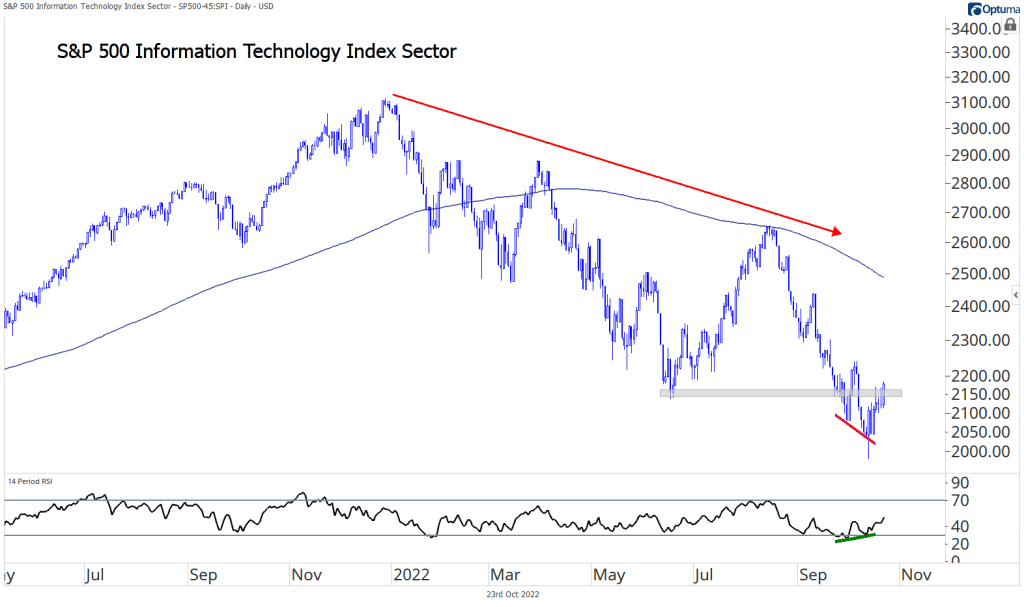 It’s early, but we may have seen the first signs of that over the past two weeks. The worst sector all year has been Communication Services, and just like the other sectors we’ve looked at, momentum put in a bullish divergence at the most recent lows.