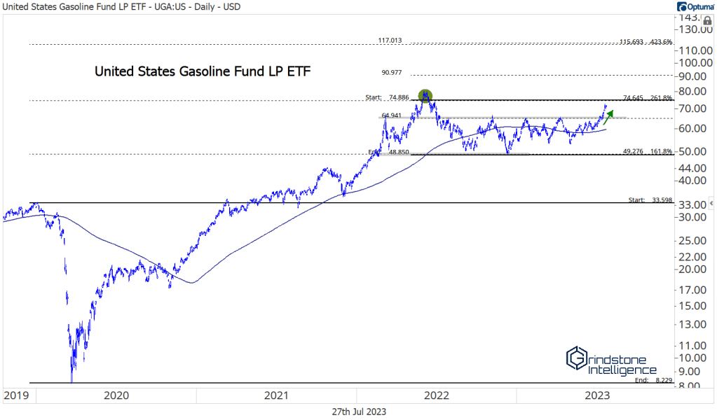 But we’re seeing relative strength elsewhere in the energy space. Gasoline (UGA) is at new 52-week highs after breaking out above stiff resistance that had been in place since last fall.