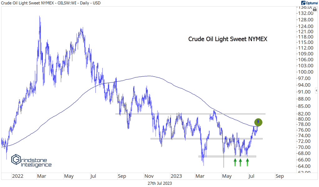 That’s what we wrote about crude two weeks ago in our Energy sector note. Since then, oil prices have continued to surge. We gapped above the 200-day moving average for the first time in almost a year, leaving sellers gasping for breath in the rearview mirror.