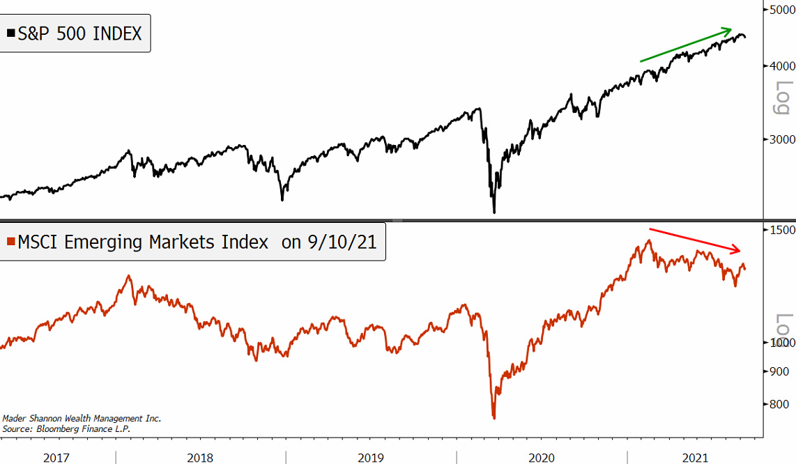 Major U.S. stock indices had a disappointing week after setting new highs just before Labor Day, but outside our borders, the Emerging Markets Index has been making lower highs and lower lows for quite some time. It’s been in a downtrend for most of 2021: