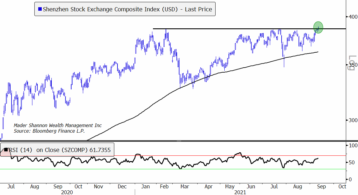 In addition, the bloodbath in tech has failed to bleed over into other sectors. Both the Shanghai and Shenzhen Composites broke out on Friday, each closing at the highest level since 2015 in U.S. Dollar terms: