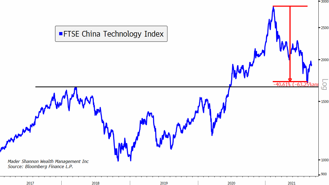 China is largely to blame, as Chinese stocks make up the majority of the index’s composition. This year, and especially this summer, we’ve seen a surge in regulatory actions by the Chinese government against large technology companies. From data protection, to private tutoring, to public offerings, to video games, the PRC has seemingly been on the warpath. Chinese technology stocks have felt the pain – the FTSE China Technology Index has fallen 40% from its peak earlier this year.