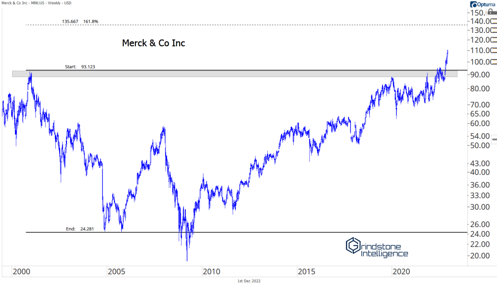Check out Merck, who’s coming out of a 20-year base. It’s already halfway to its target near 135.