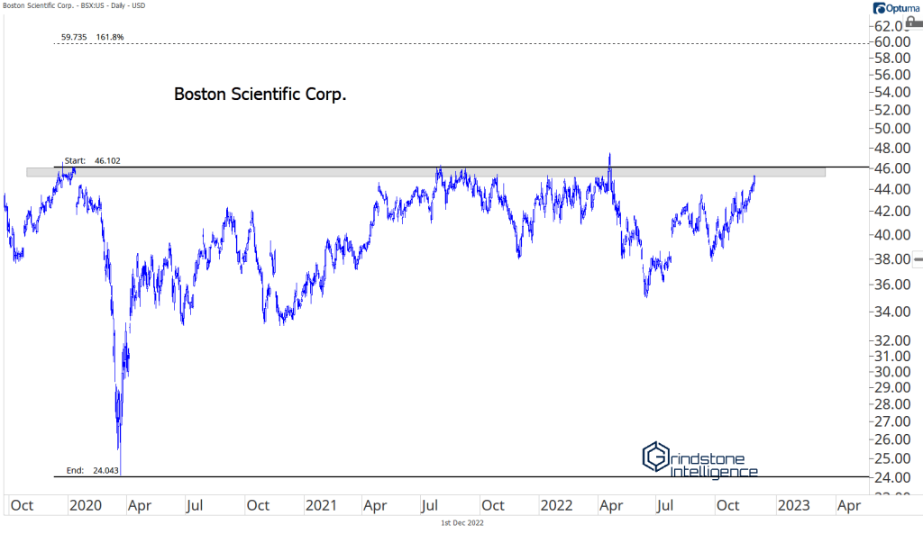 Now they’re looking to join the party. Boston Scientific is trying to break out above its pre-COVID highs at 46. If it does, we can target 60.