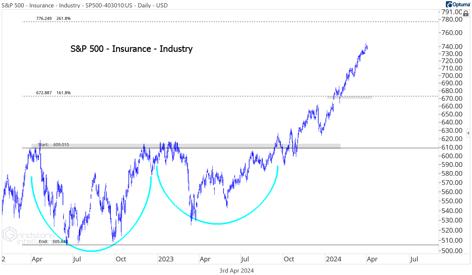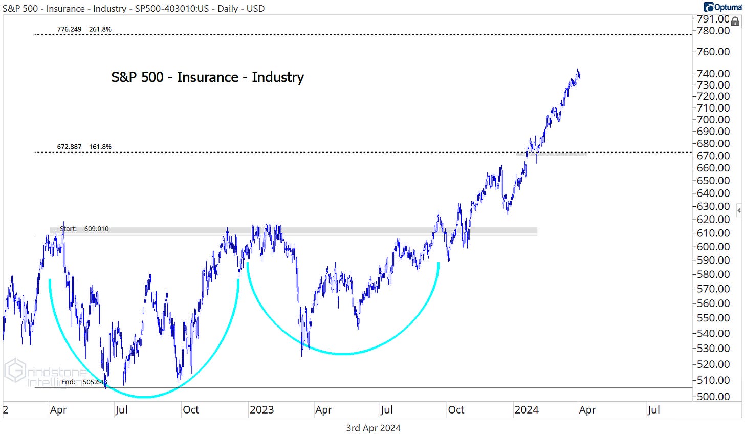 Insurance is in the middle of the pack at 30%, but it’s had the smoothest ride along the way. So far in 2024, it hasn’t had a pullback of more than 2%. We think there’s still room for the group to go higher, with potential resistance up at the 261.8% retracement from the 2022 decline.