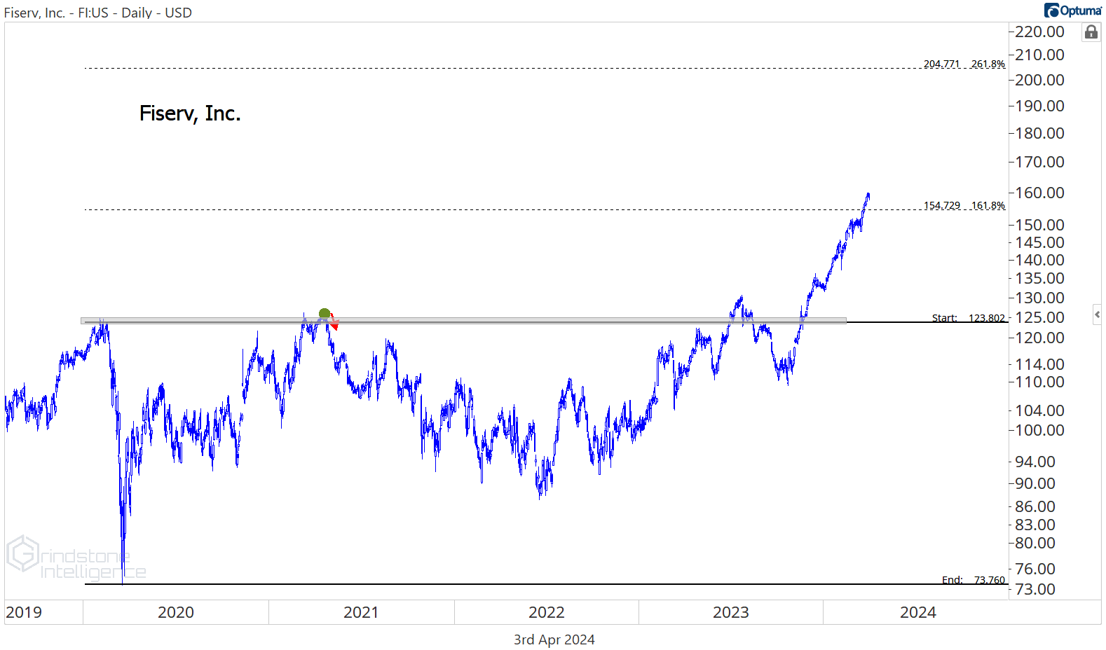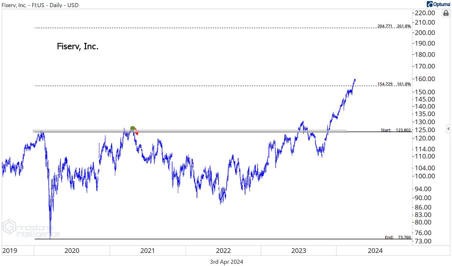 Fiserv has no downtrend to reverse. It’s climbed past our former target of $155 to reach new all time highs.