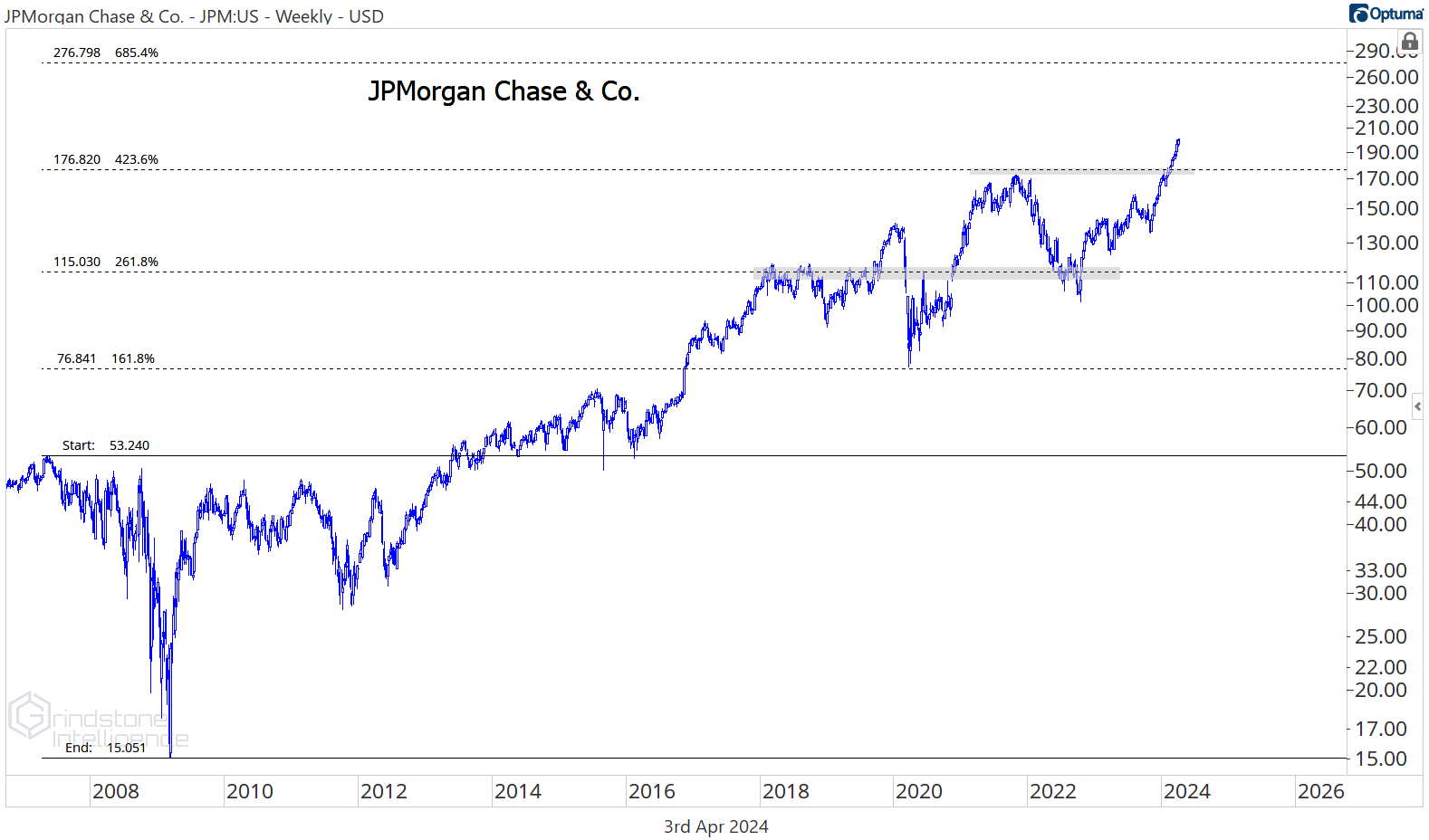 With JPM setting new highs, you’ll have a hard time convincing us that we’re in the midst of anything other than a healthy bull market. It was stuck below the 423.6% retracement from the 2007-2009 decline for the last few years, but it just broke out above that key resistance level. We want to be buying JPM above $180 with a target of $275.