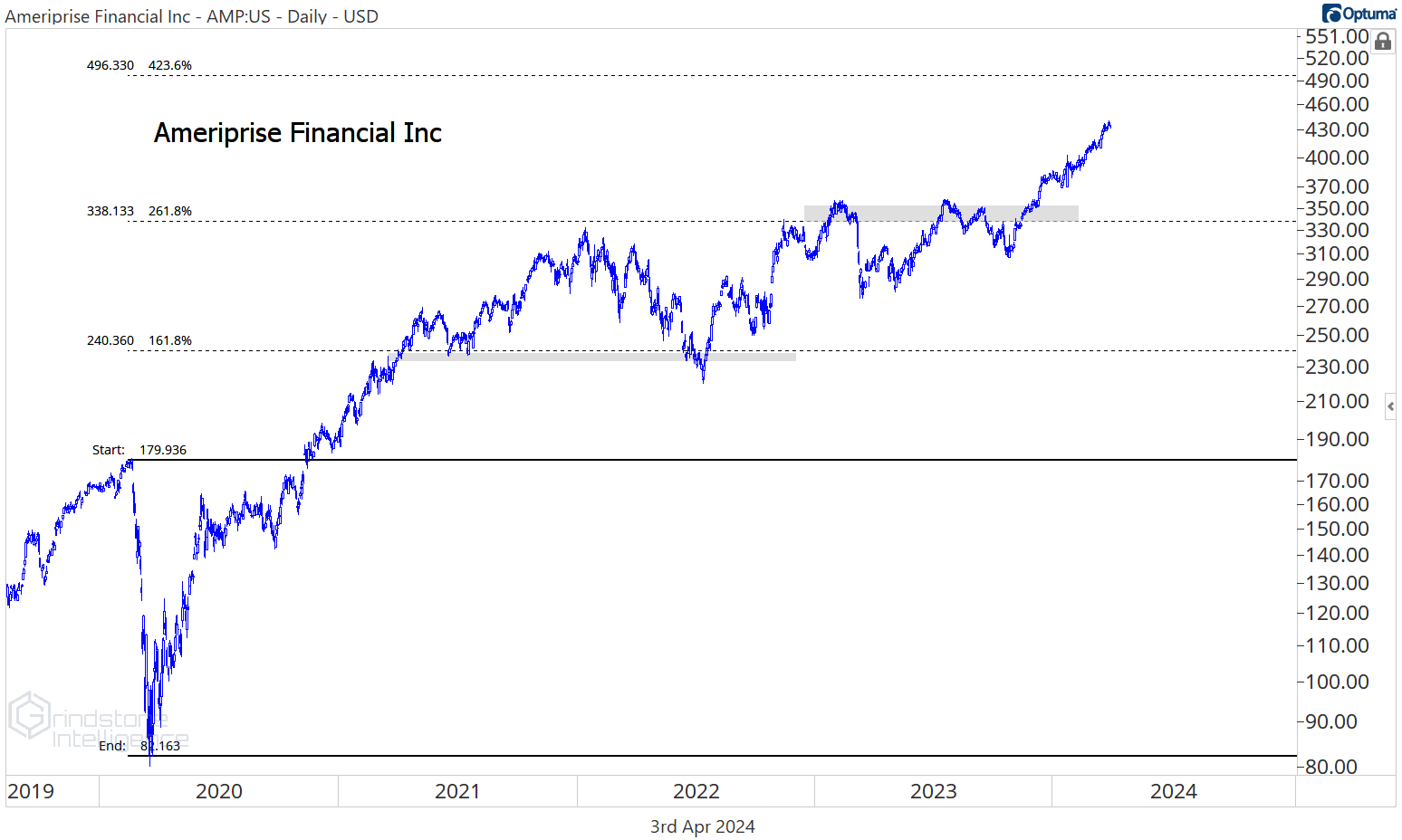 The risk/reward isn’t great here for AMP as it trades halfway between support at $340 and potential resistance near $500, but it’s definitely one to keep a close eye on for when the setup improves.